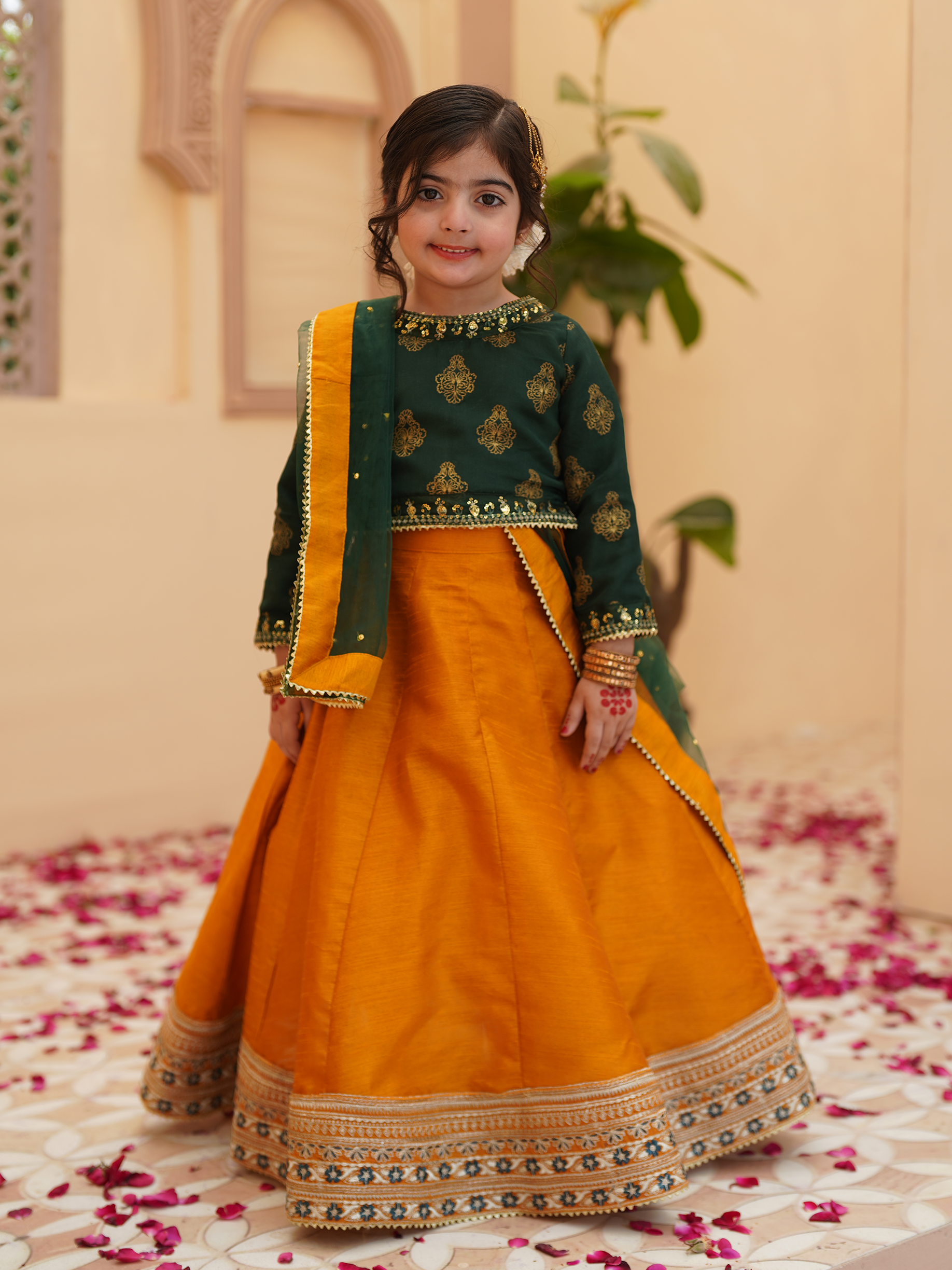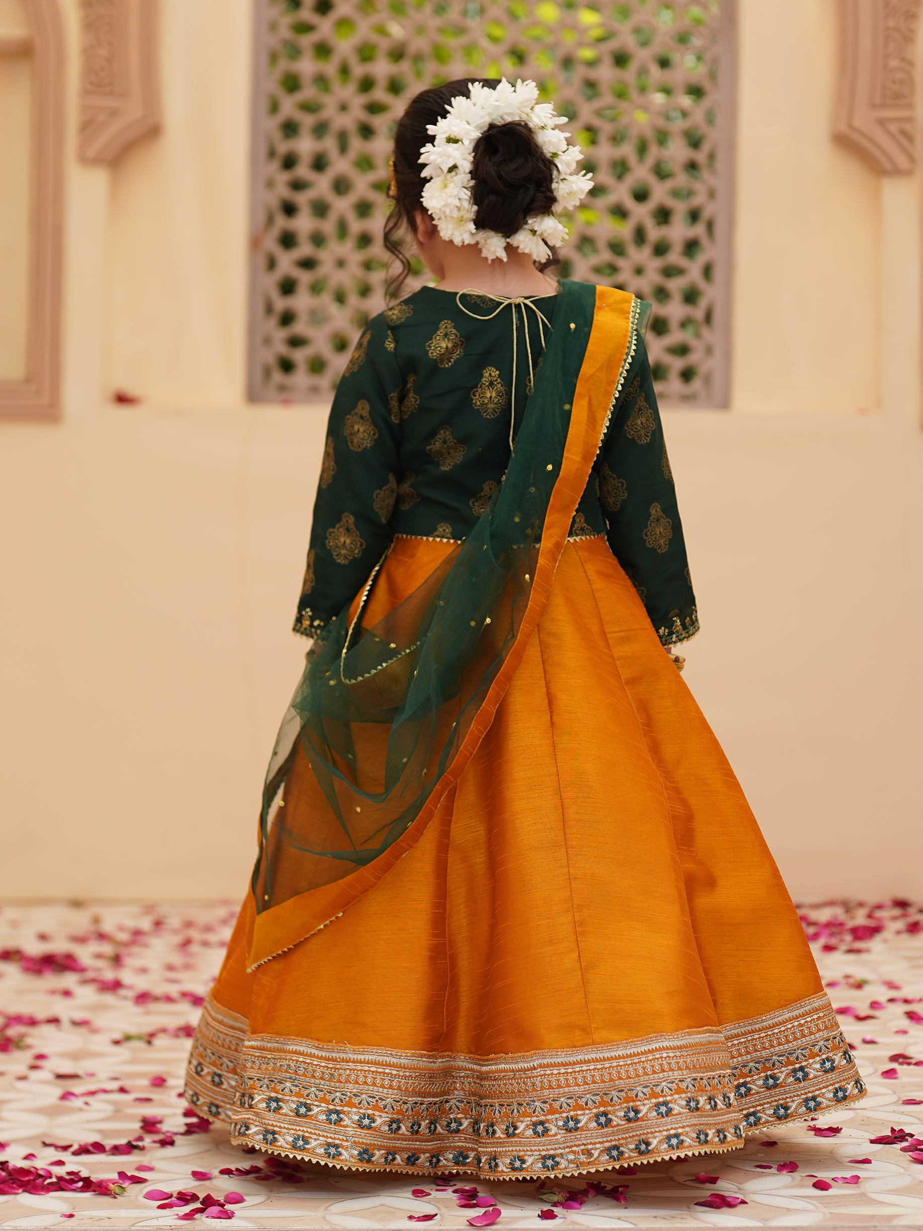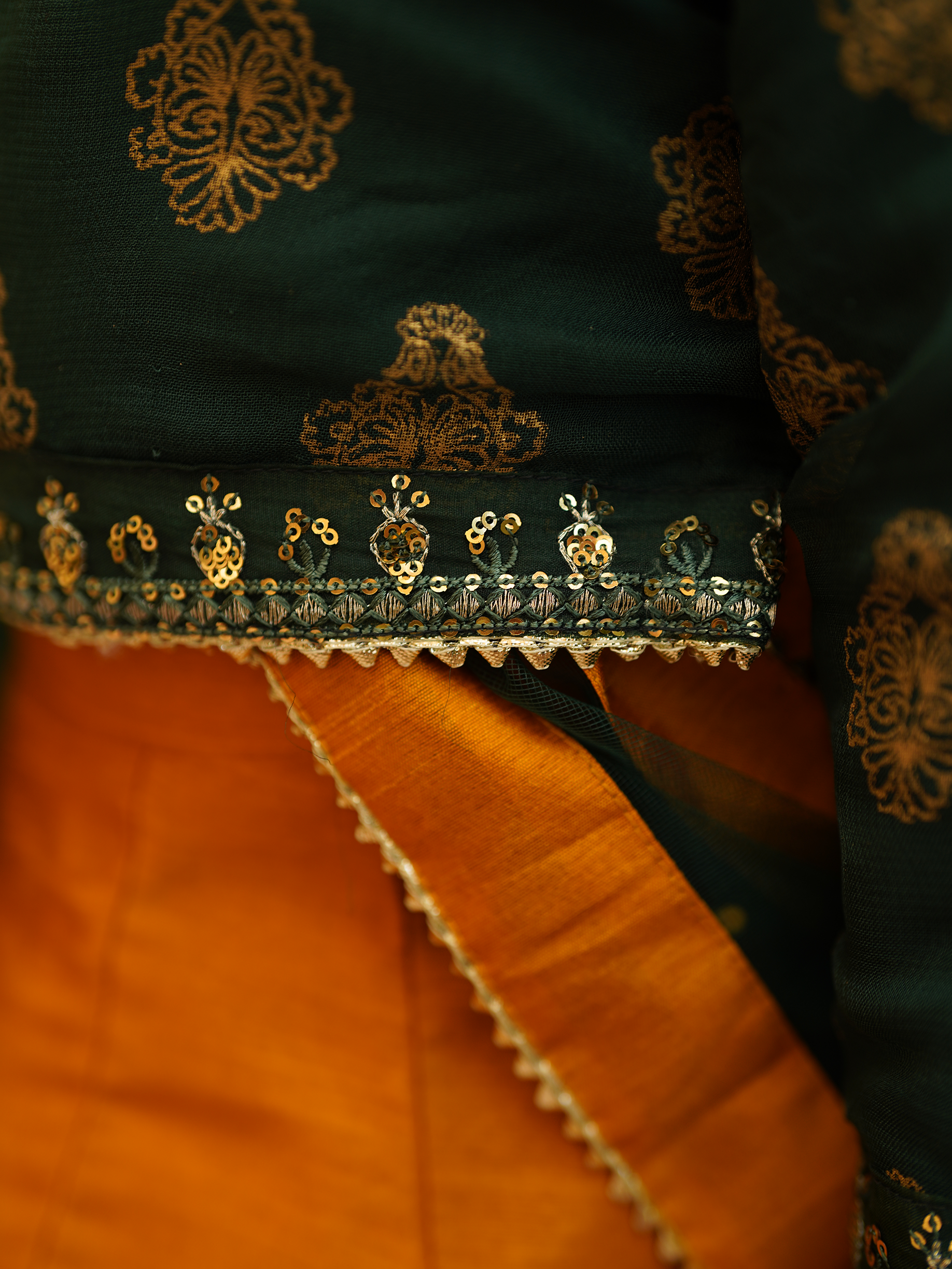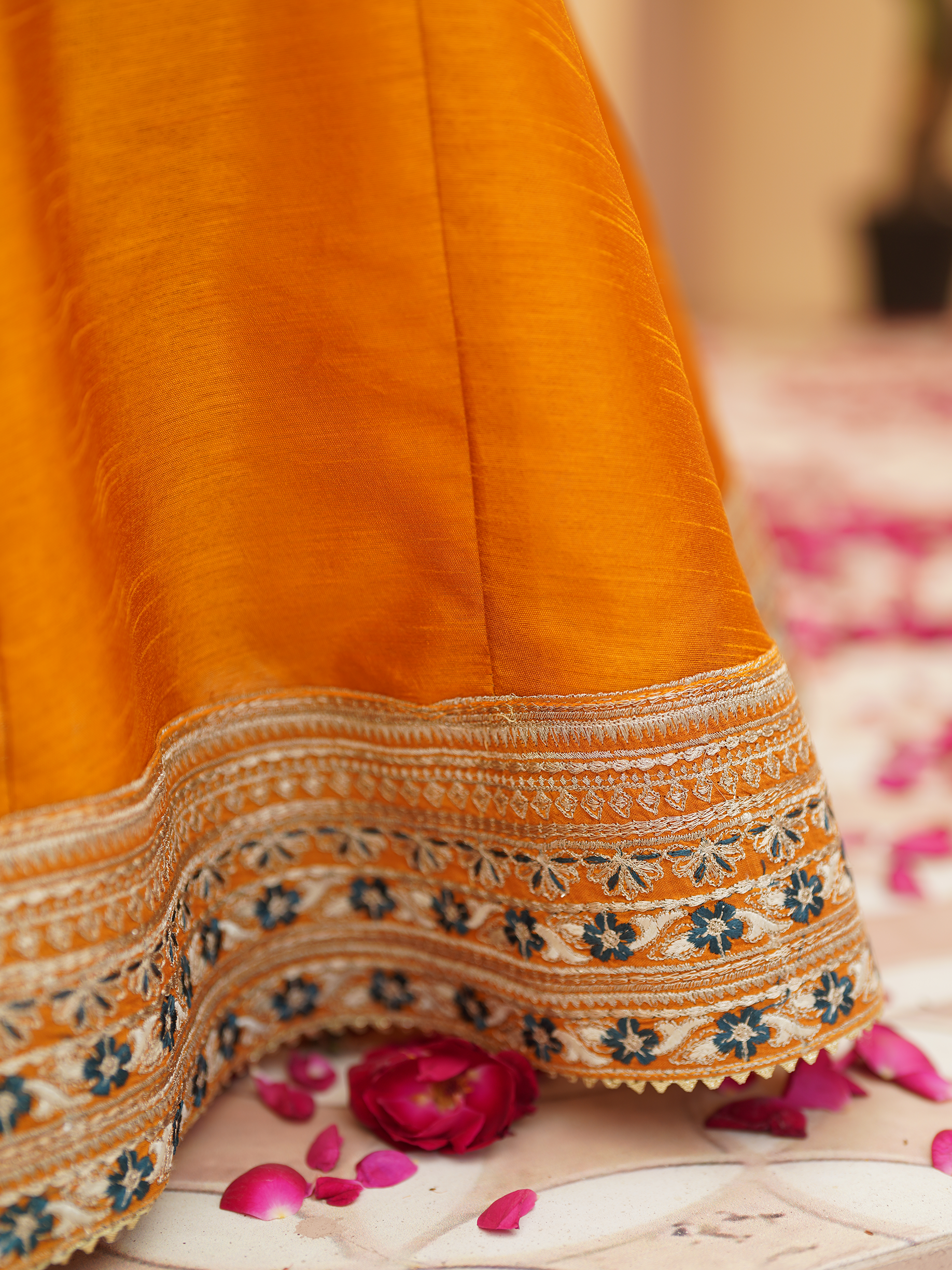 - Chiffon choli with screen print and an embroidered neckline, finished with back tassels. Paired with a raw silk lehnga featuring an embroidered border and high-volume cancan. Comes with a sitara net dupatta for a complete festive look