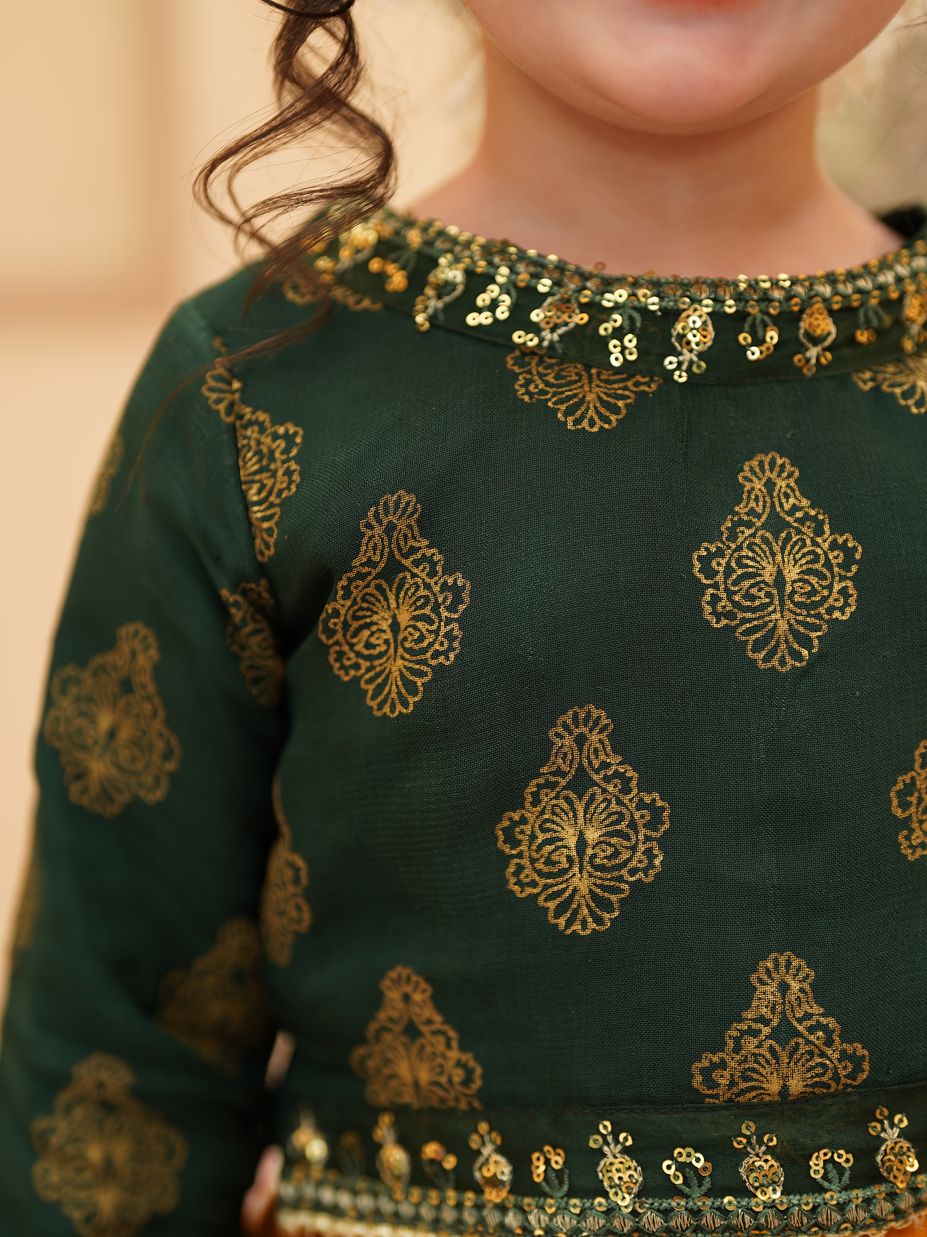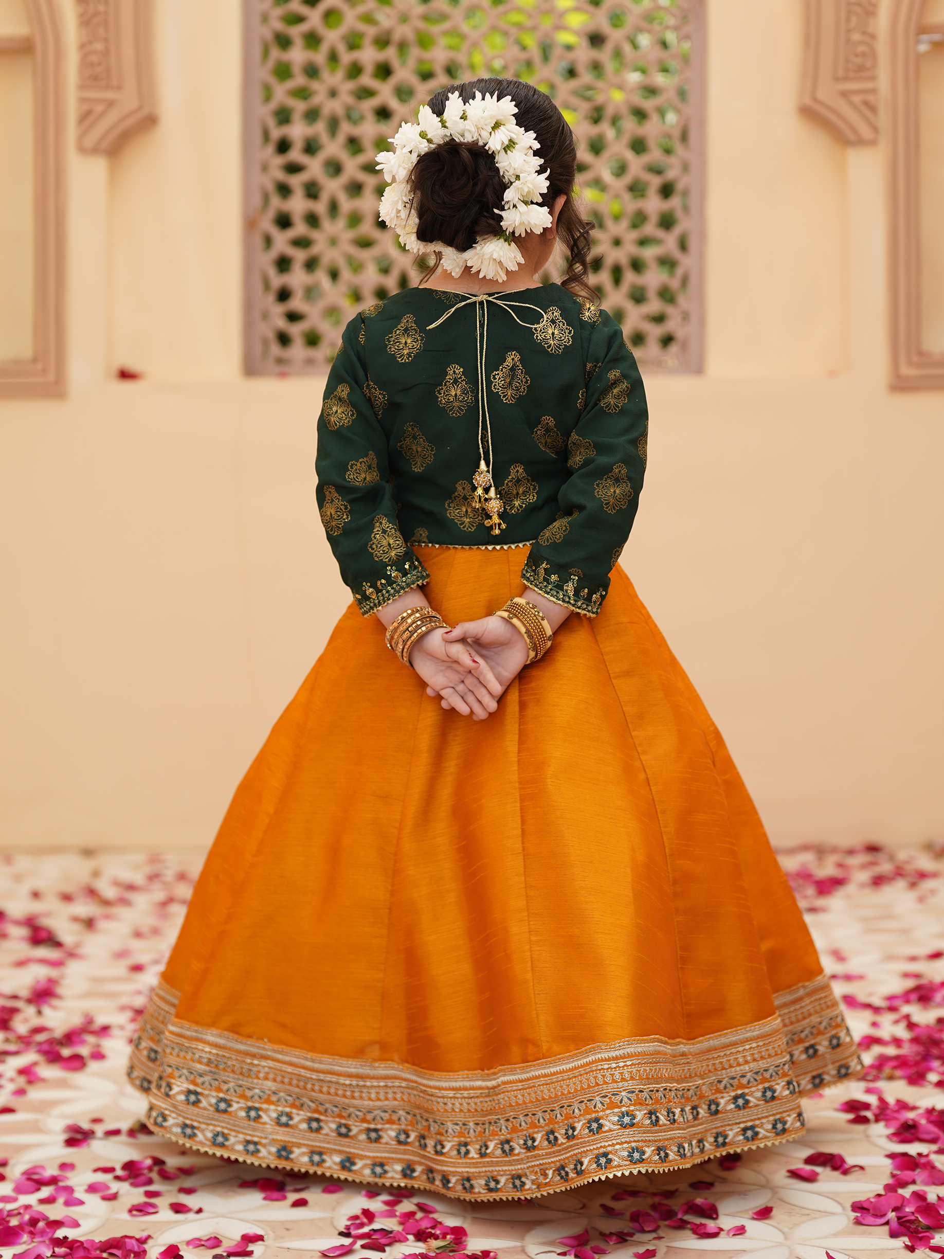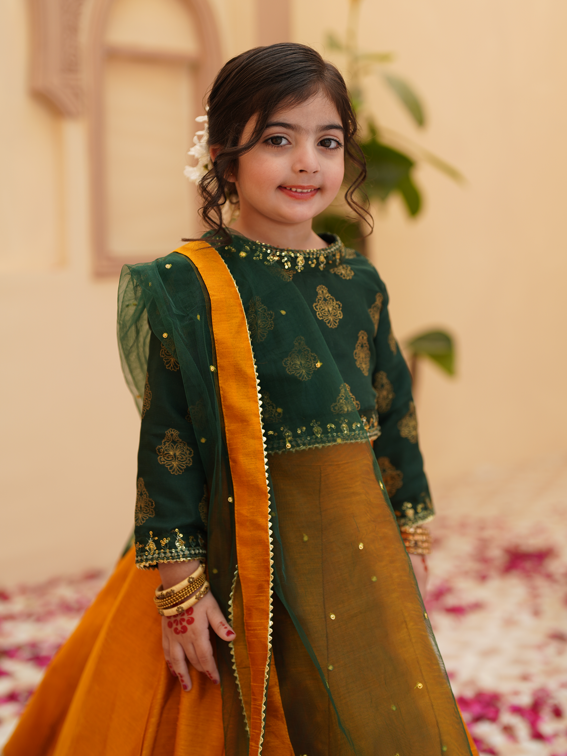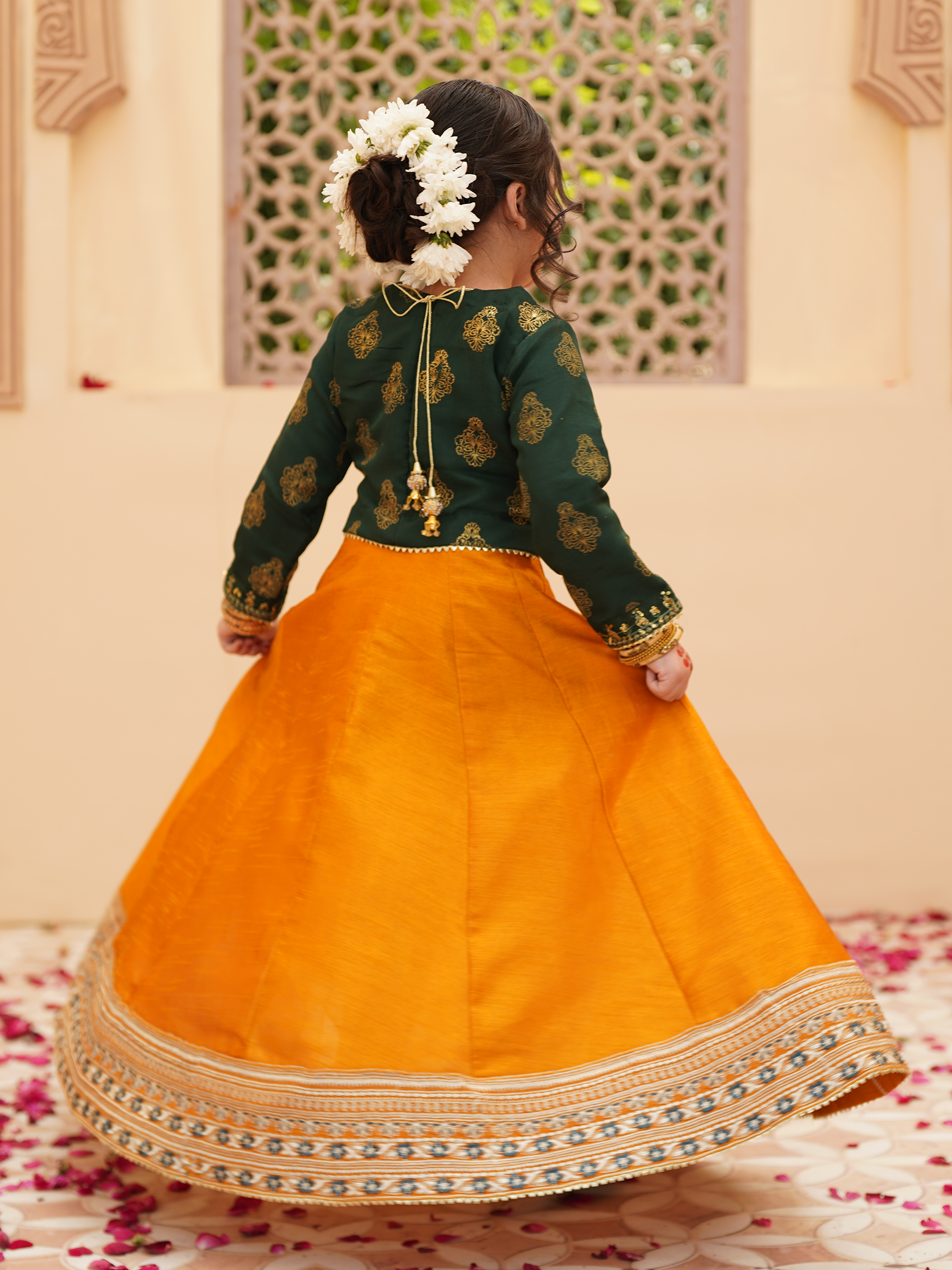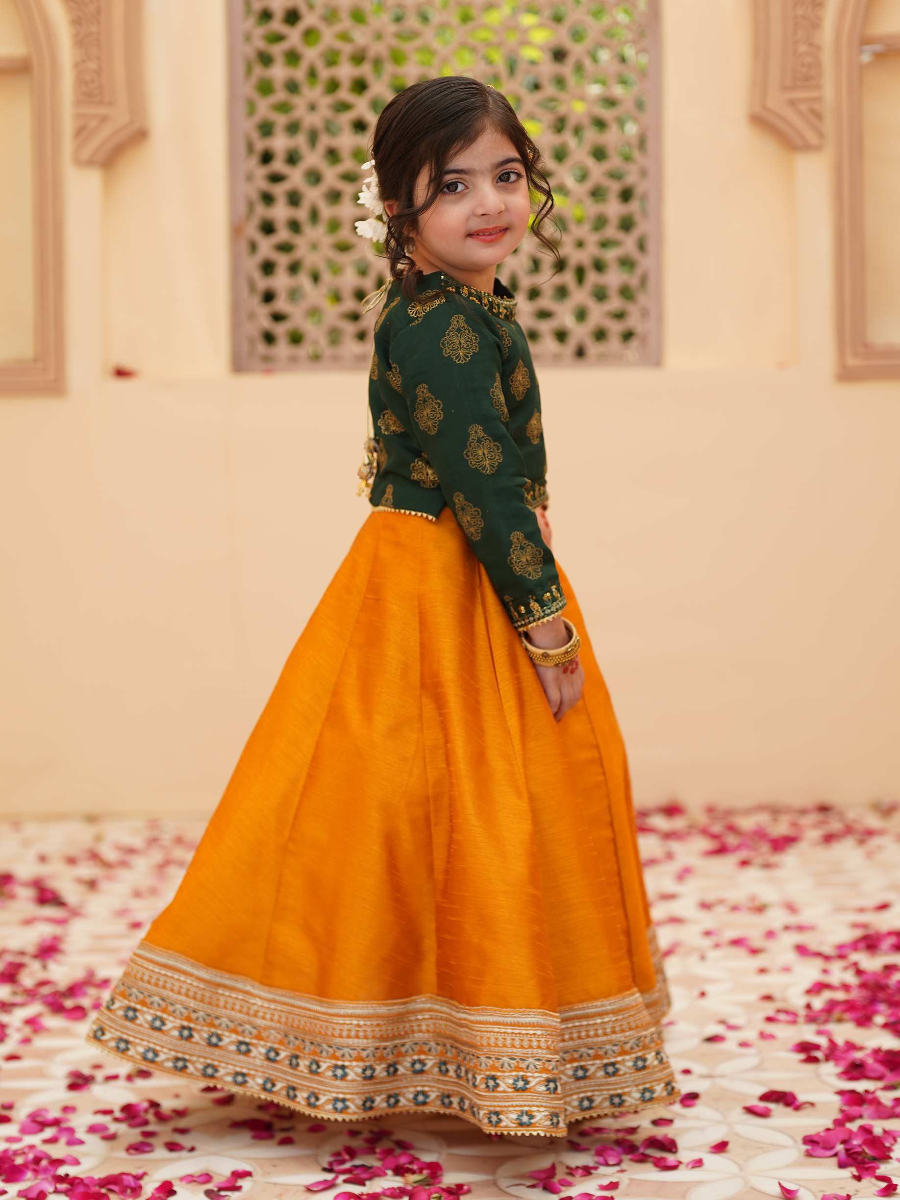 - Chiffon choli with screen print and an embroidered neckline, finished with back tassels. Paired with a raw silk lehnga featuring an embroidered border and high-volume cancan. Comes with a sitara net dupatta for a complete festive look