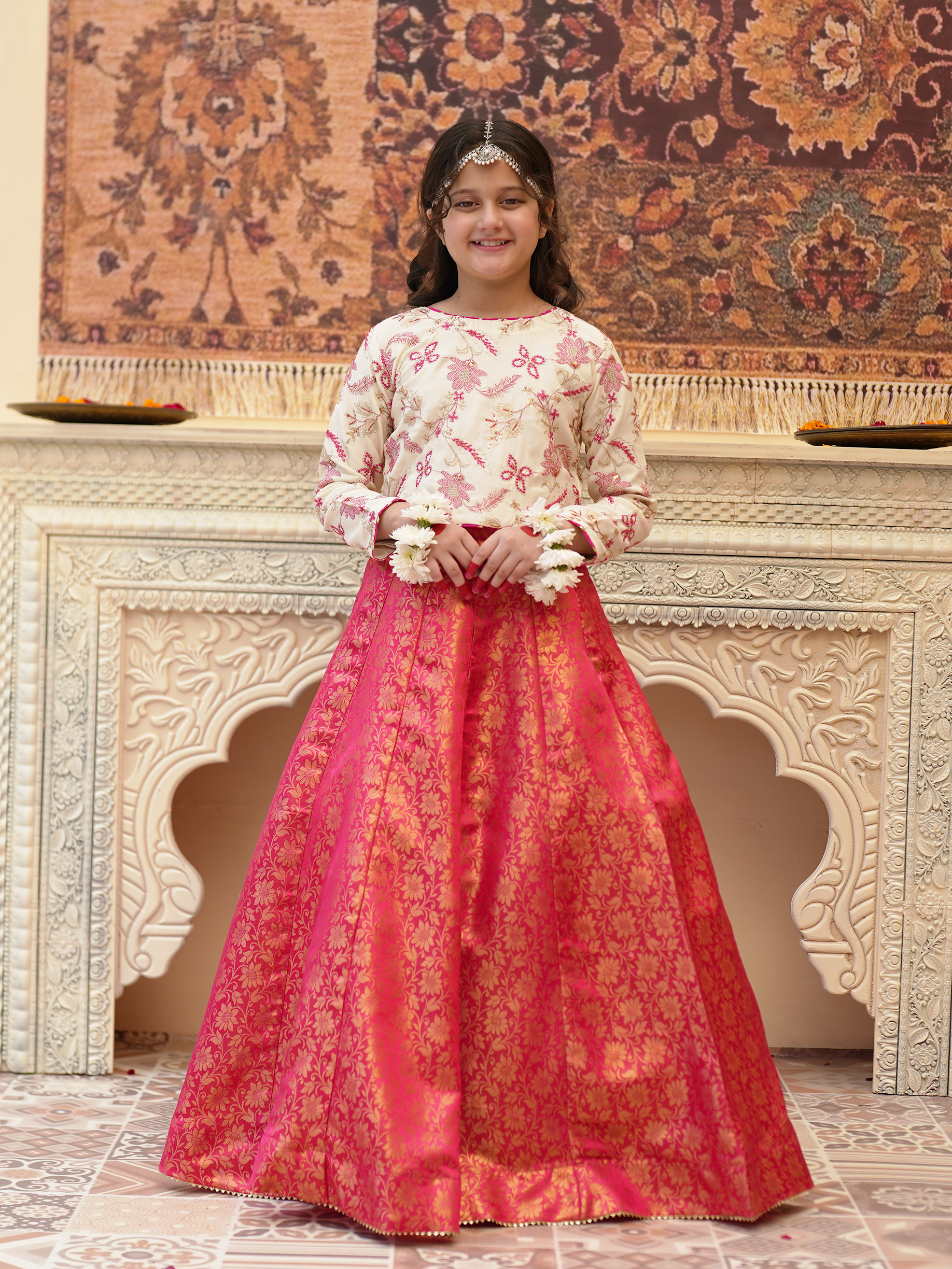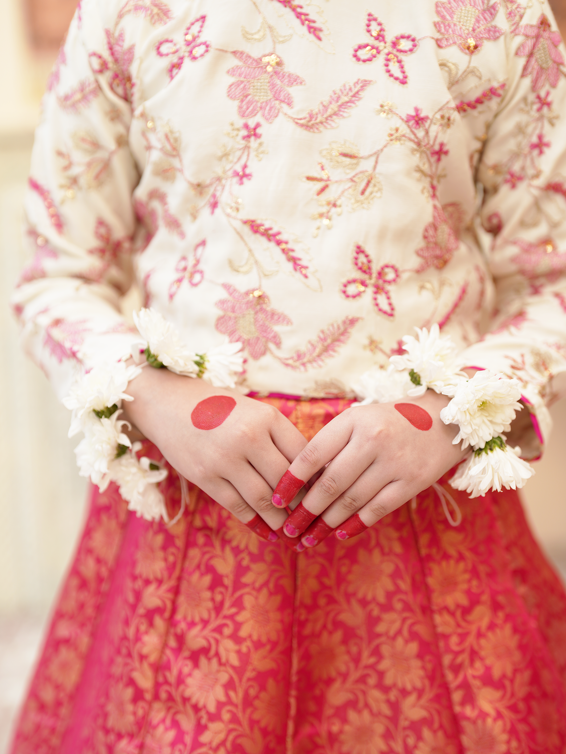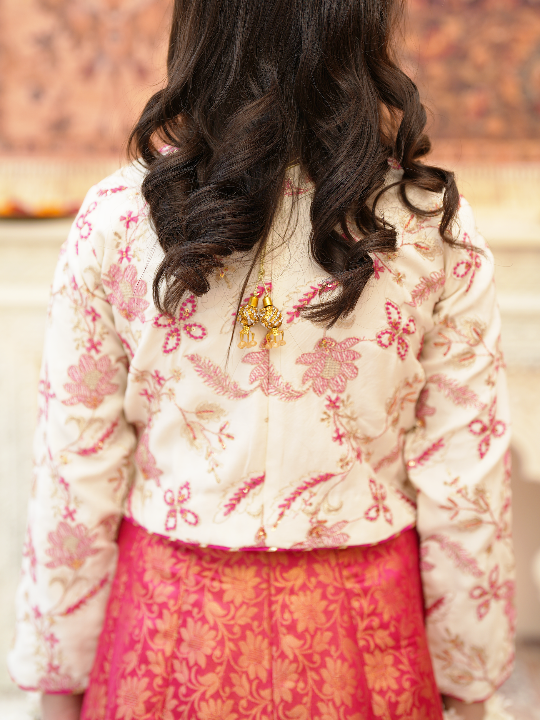 - Soft raw silk embroidered choli finished with pink gotta lace and back tassels. Paired with a banarsi lehnga featuring high-volume cancan for a fuller look. Comes with a sitara net dupatta to complete the outfit.