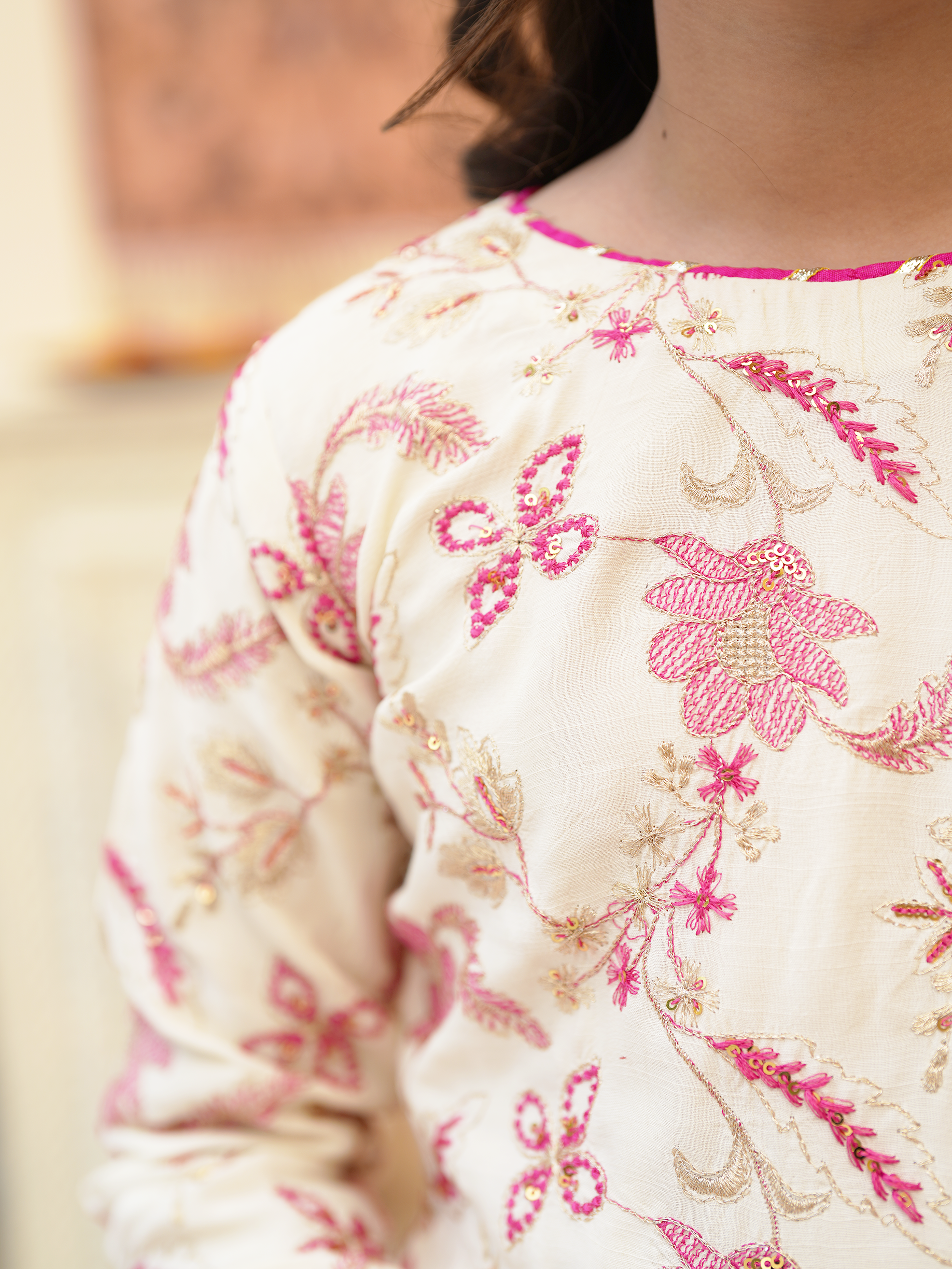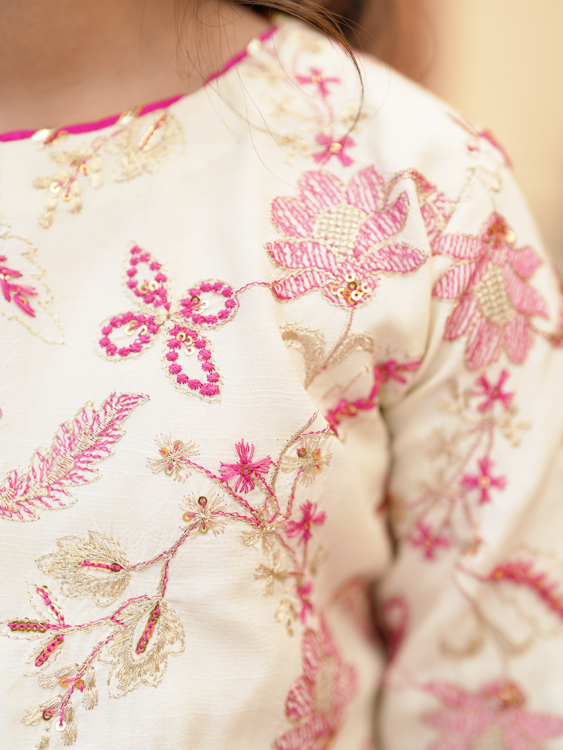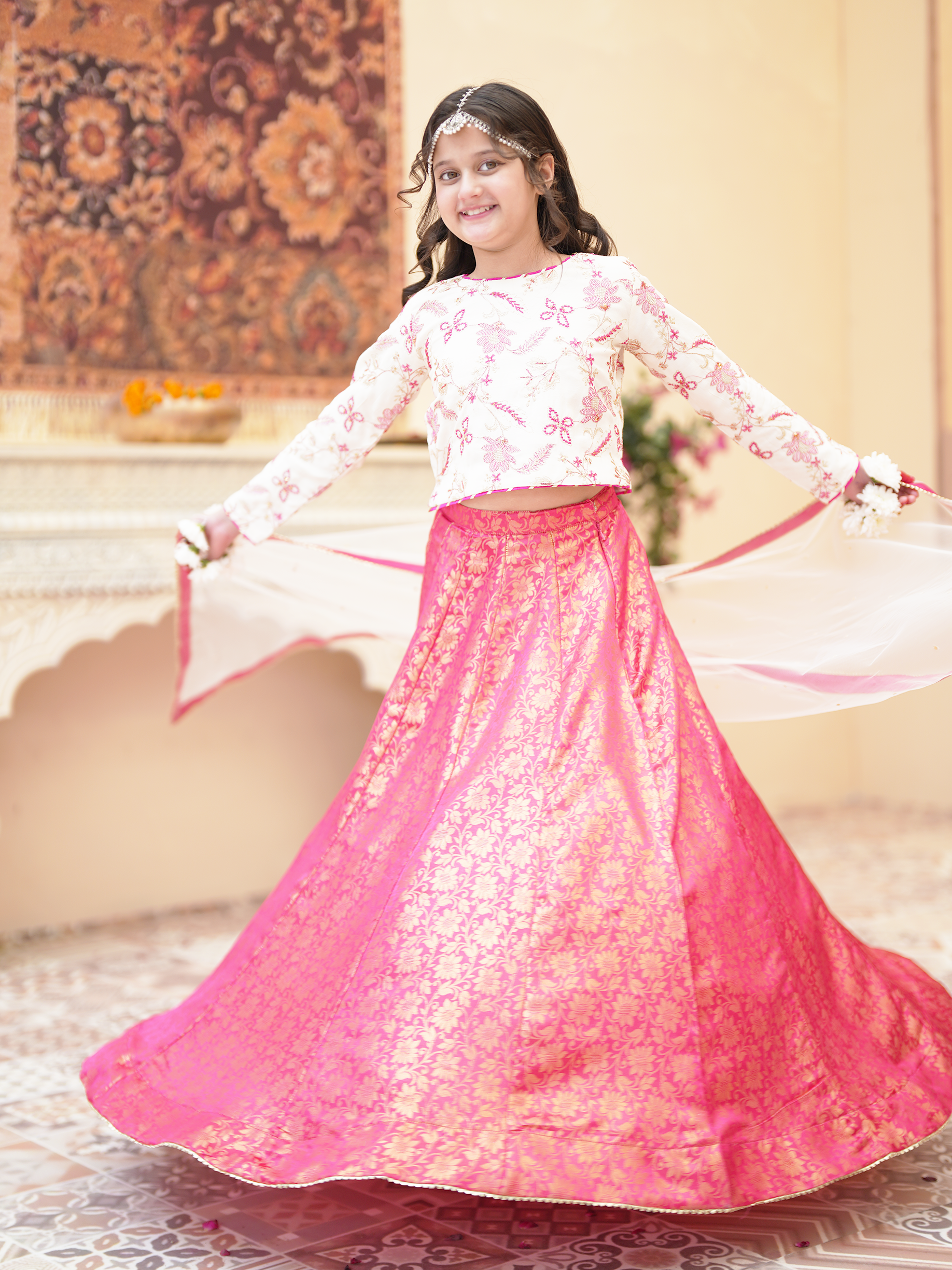 - Soft raw silk embroidered choli finished with pink gotta lace and back tassels. Paired with a banarsi lehnga featuring high-volume cancan for a fuller look. Comes with a sitara net dupatta to complete the outfit.