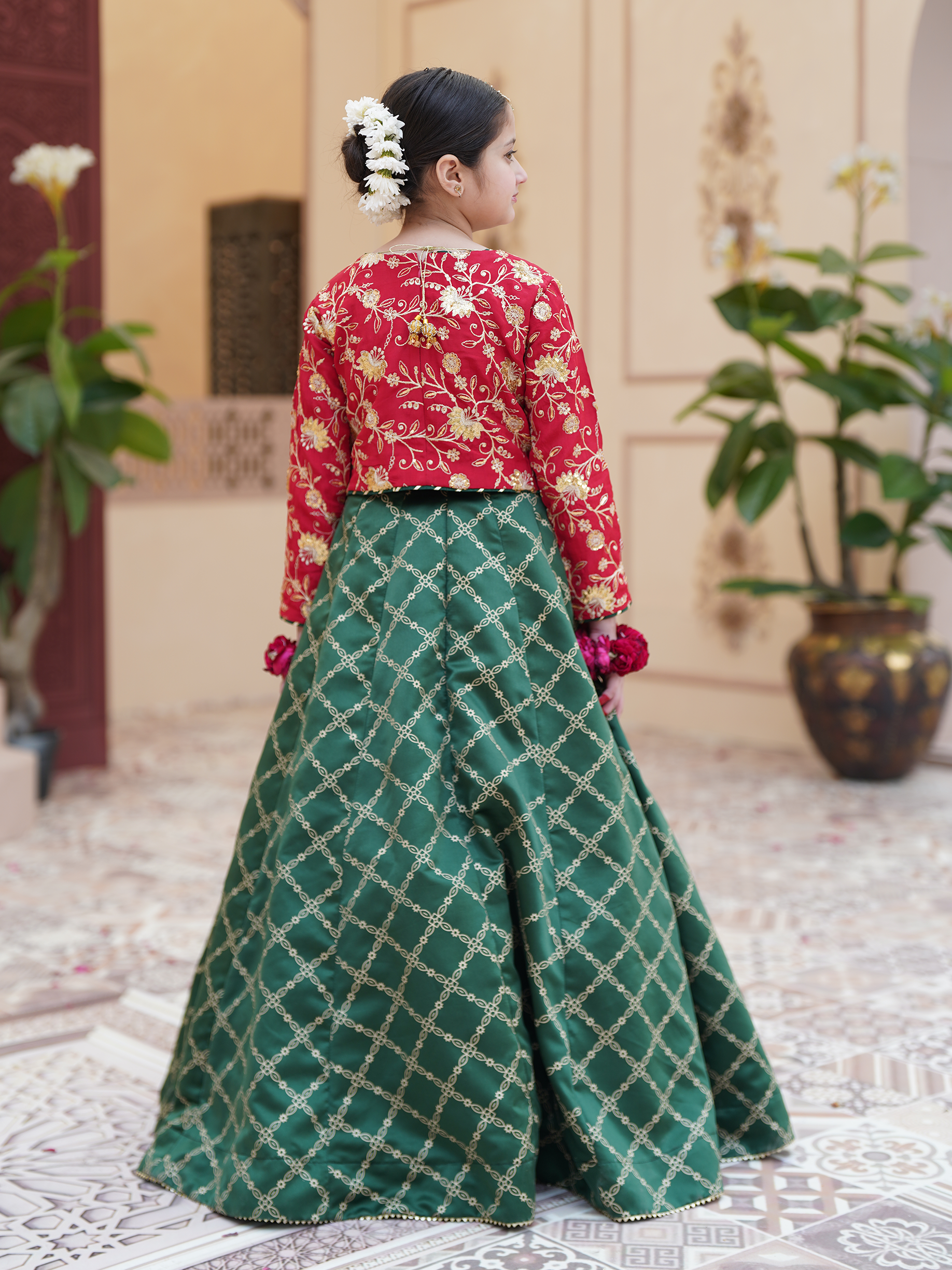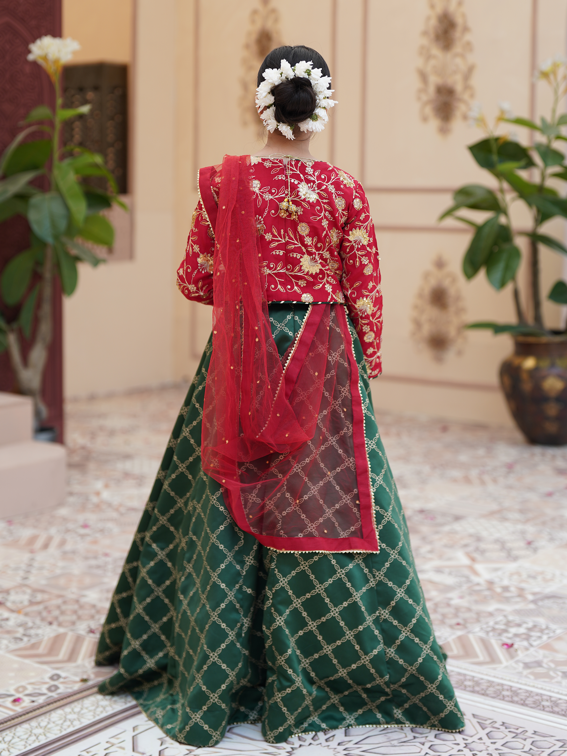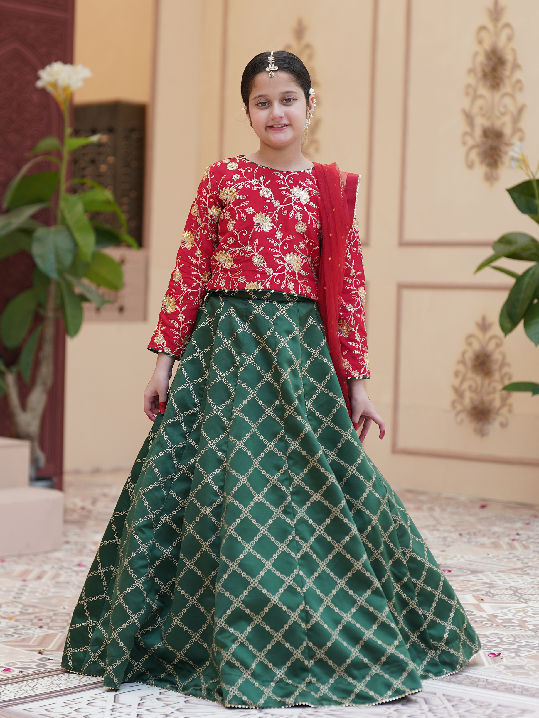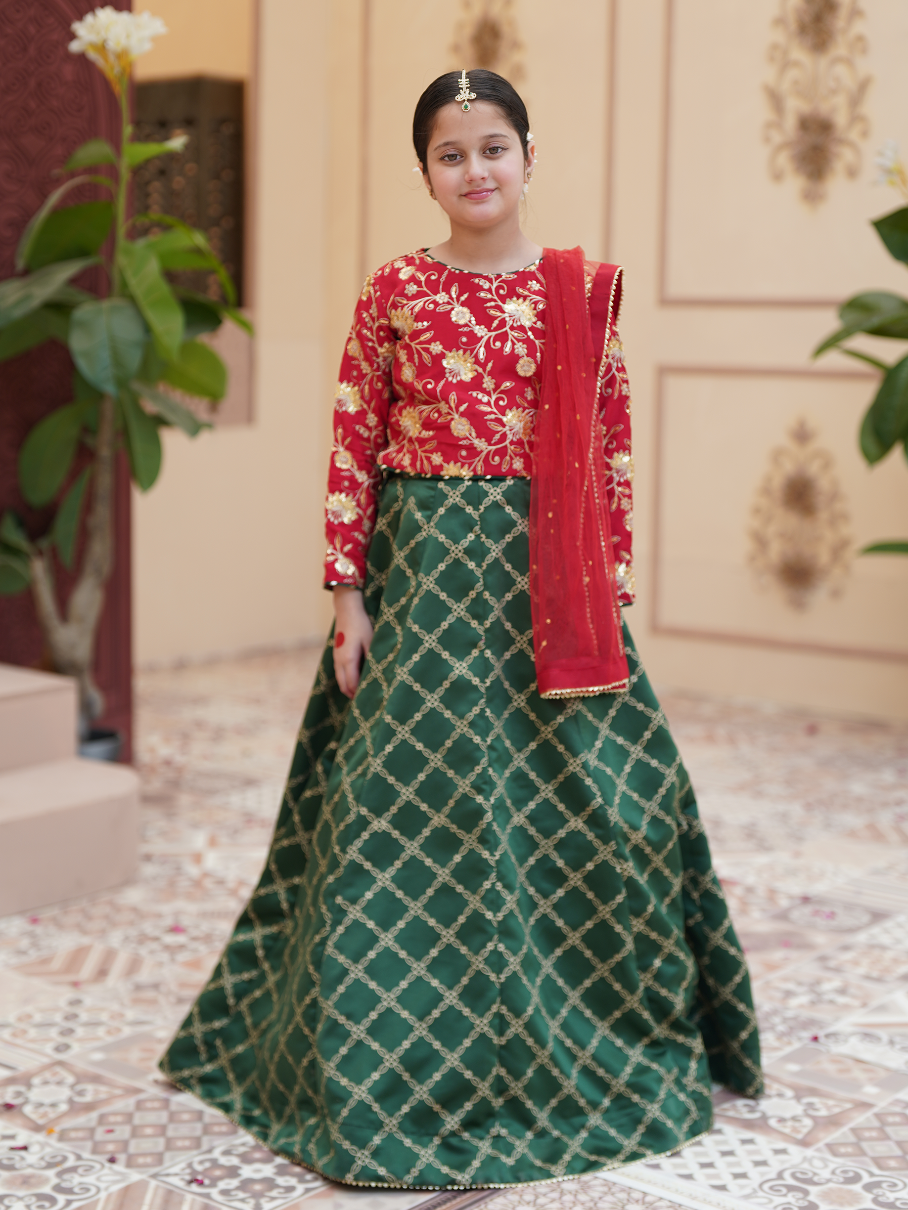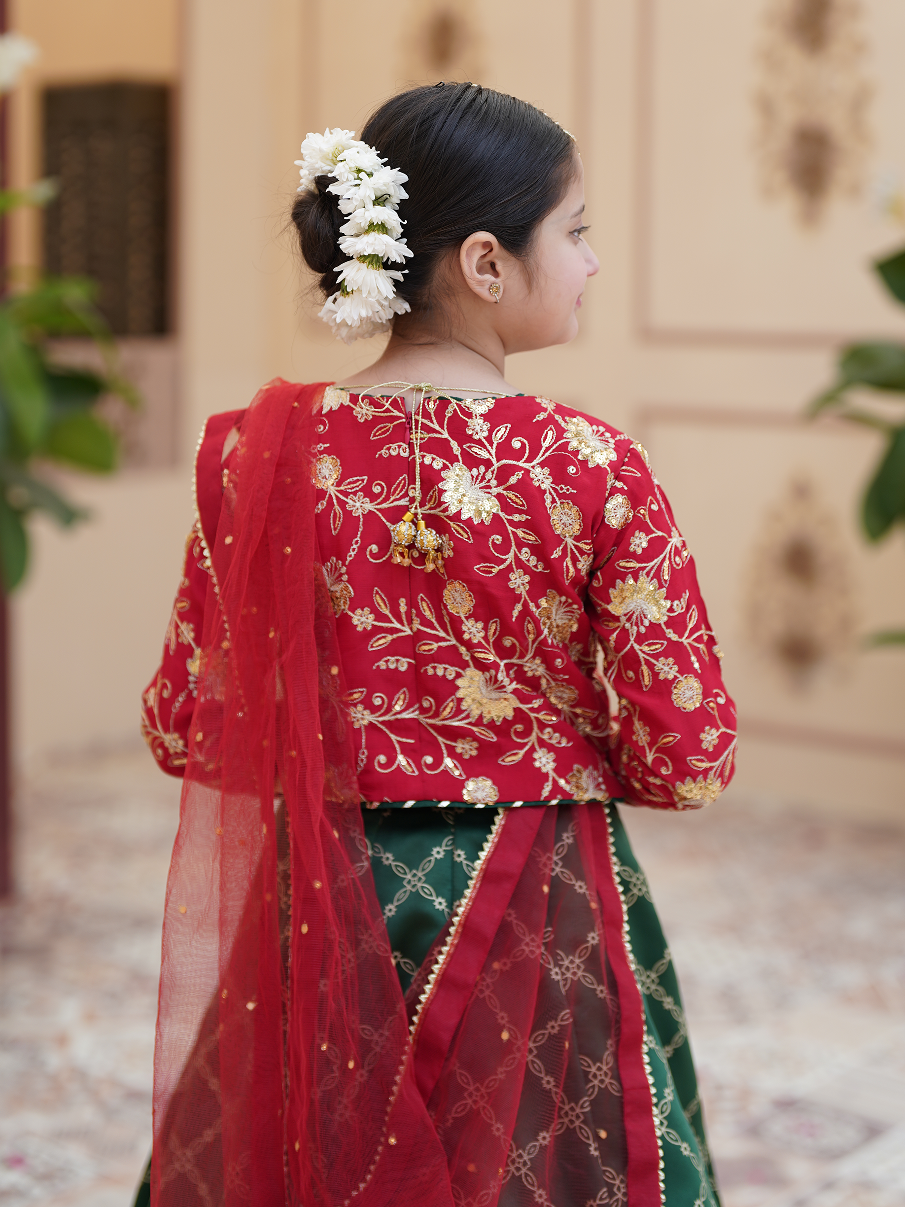 - Fully embroidered soft raw silk choli with green gotta lace and back tassels. Paired with a screen-print silk lehnga featuring high-volume cancan for a fuller look. Comes with a sitara net dupatta to complete the outfit.