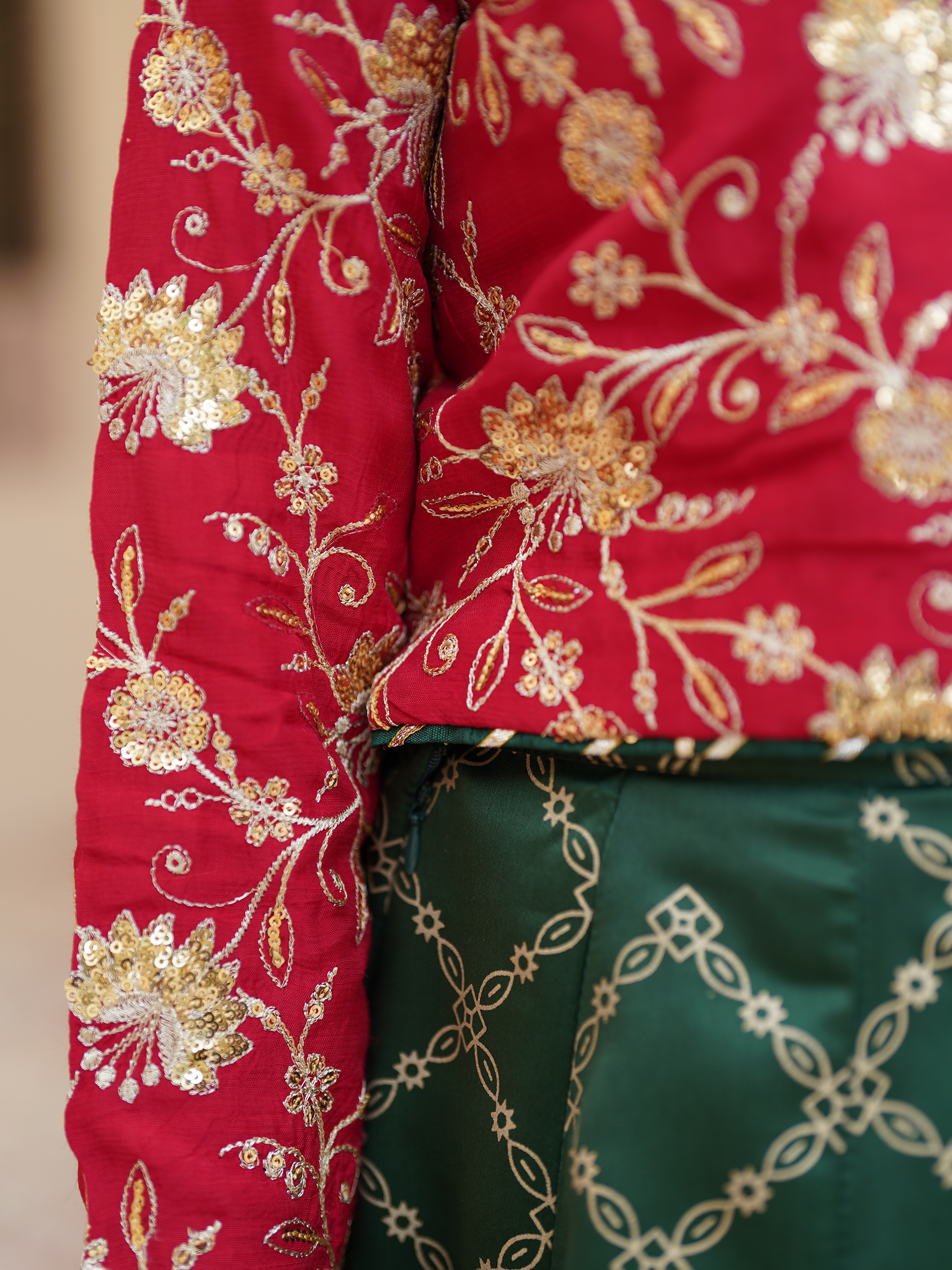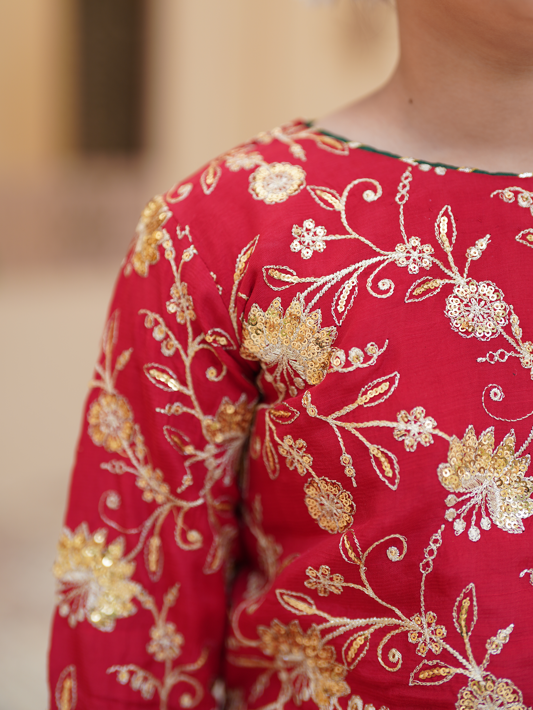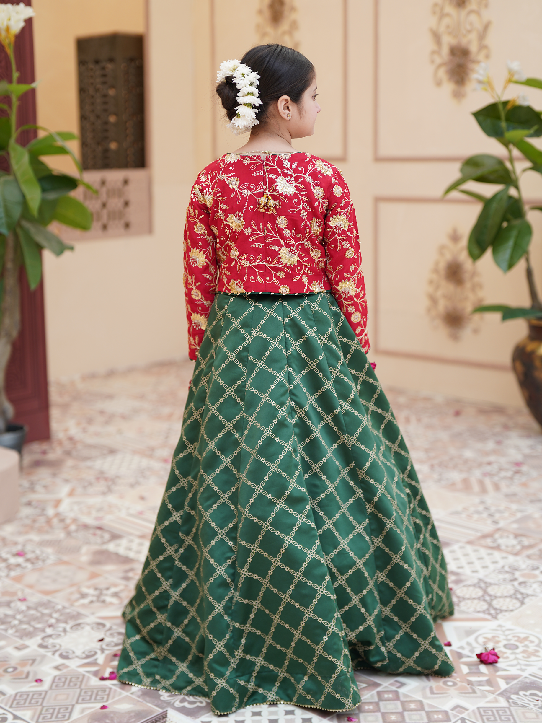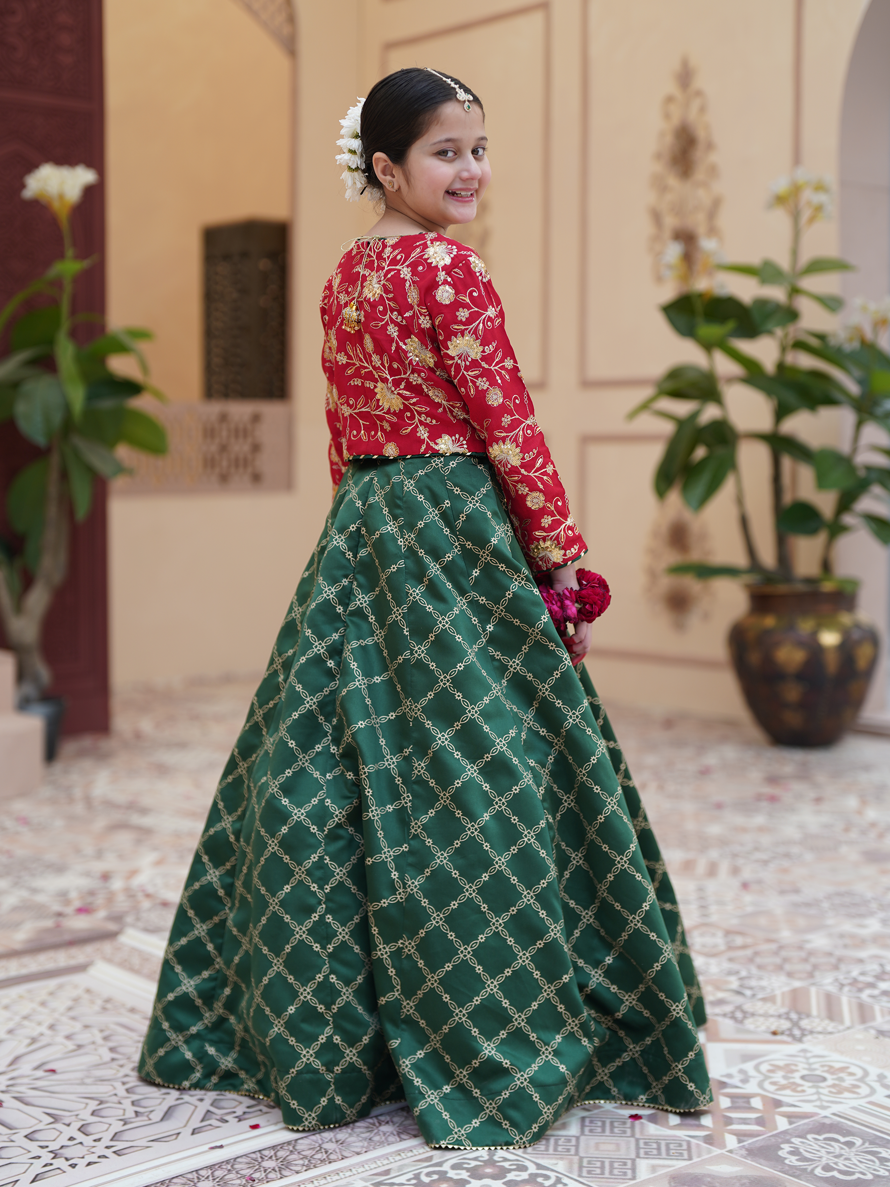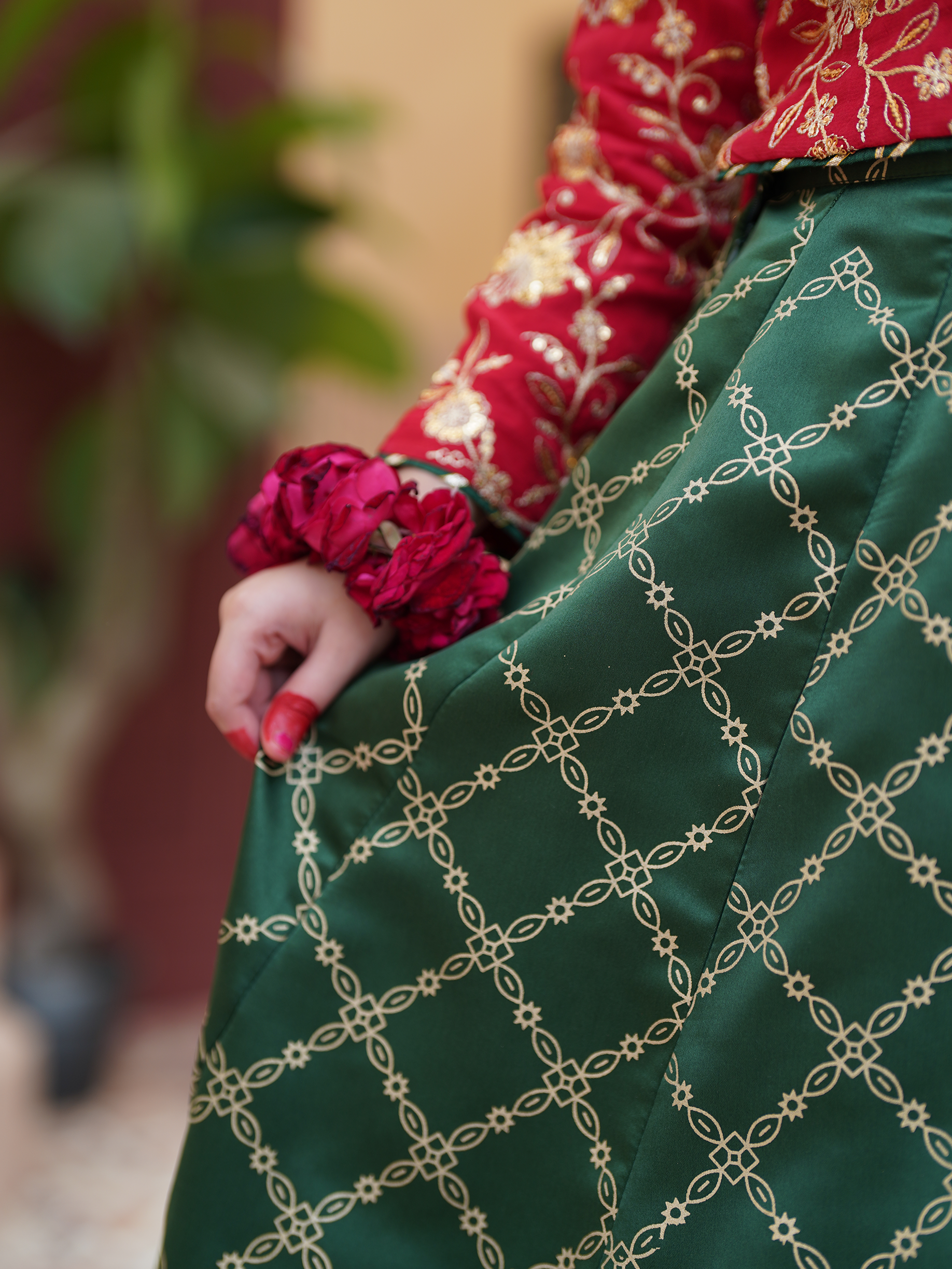 - Fully embroidered soft raw silk choli with green gotta lace and back tassels. Paired with a screen-print silk lehnga featuring high-volume cancan for a fuller look. Comes with a sitara net dupatta to complete the outfit.