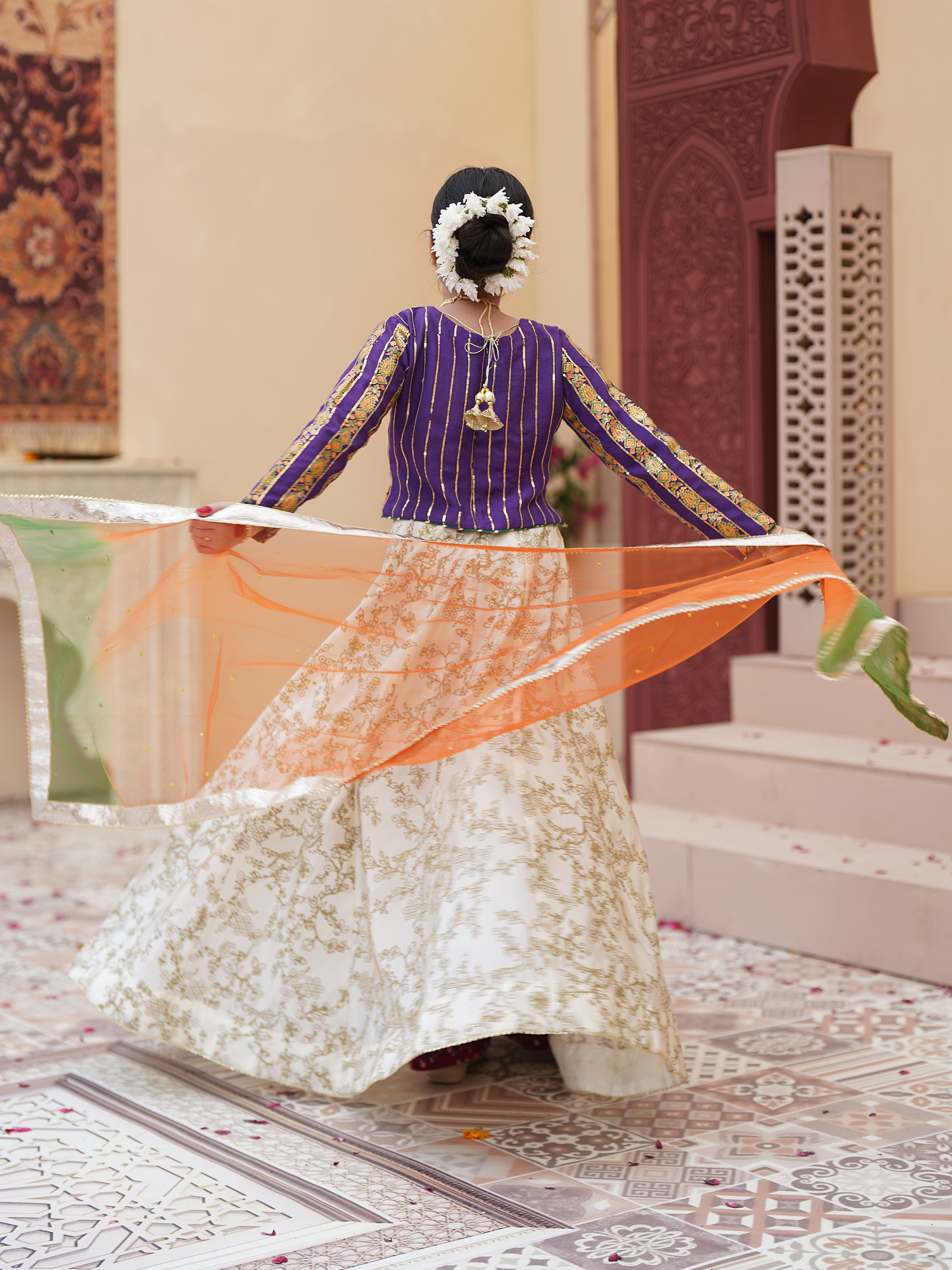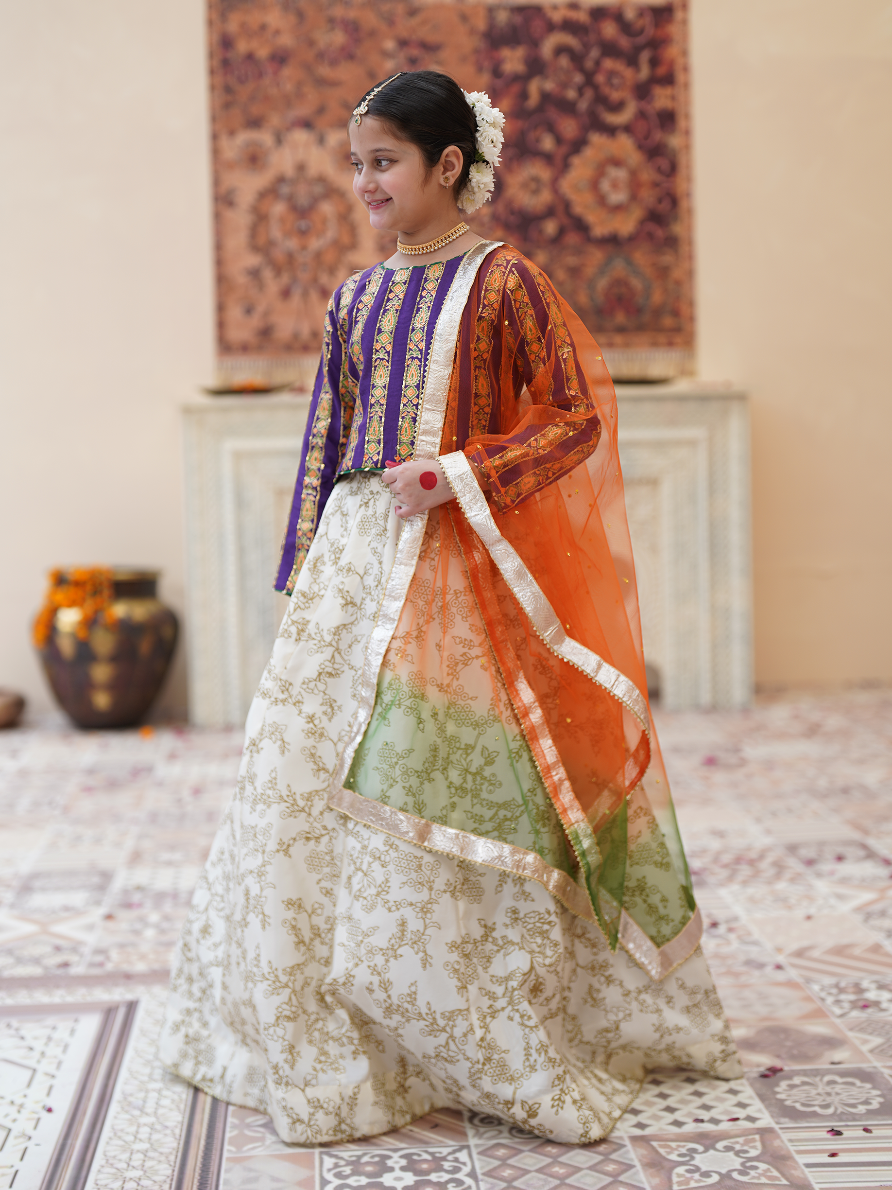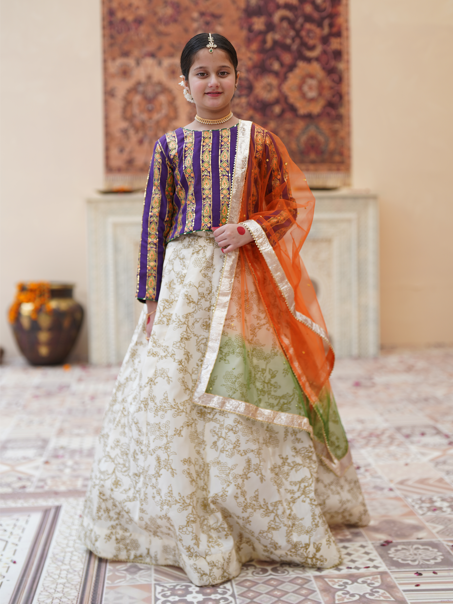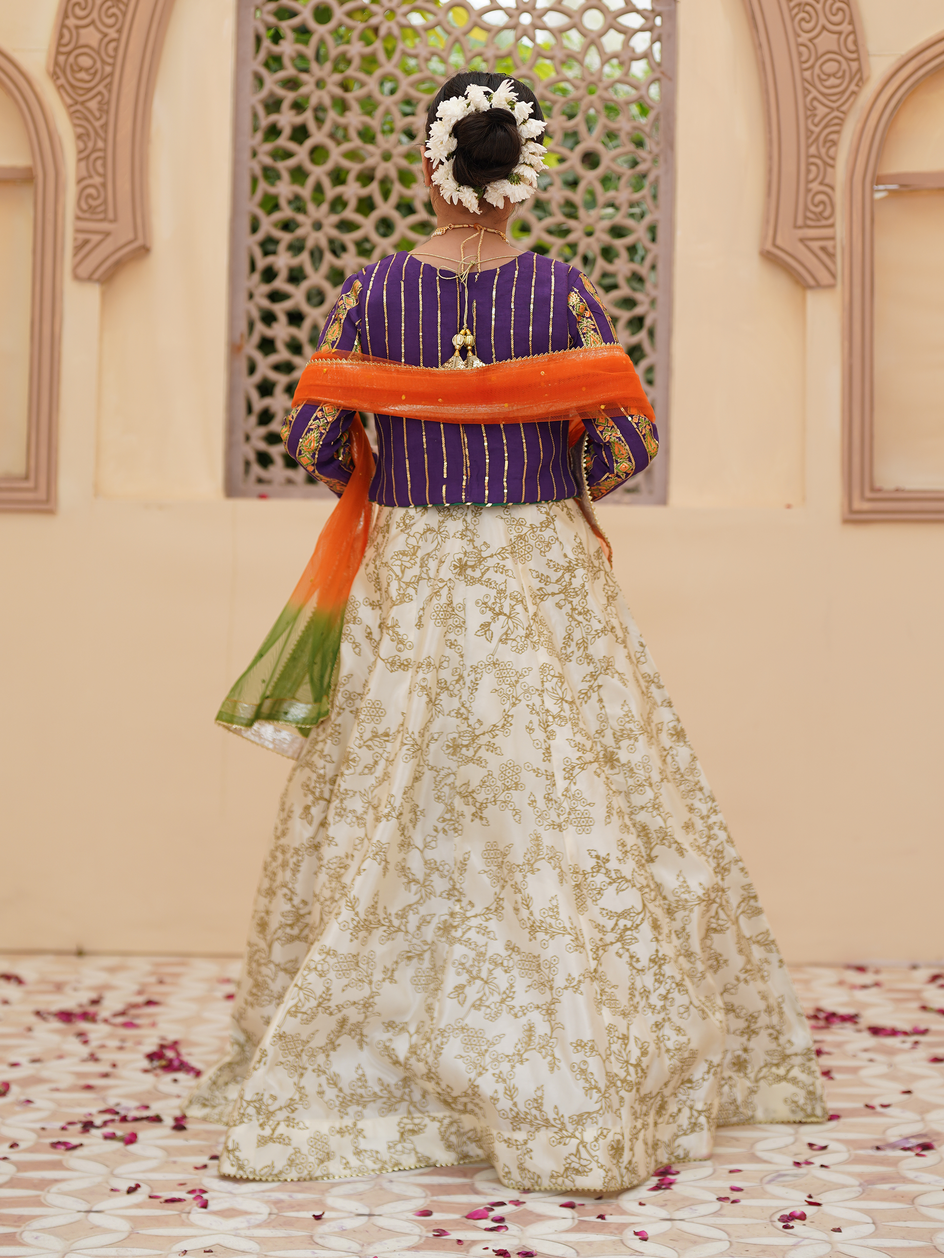 - Fully embroidered soft raw silk choli with green gotta lace and back tassels. Paired with a screen-print silk lehnga featuring high-volume cancan for a fuller look. Comes with a sitara net dupatta to complete the outfit.