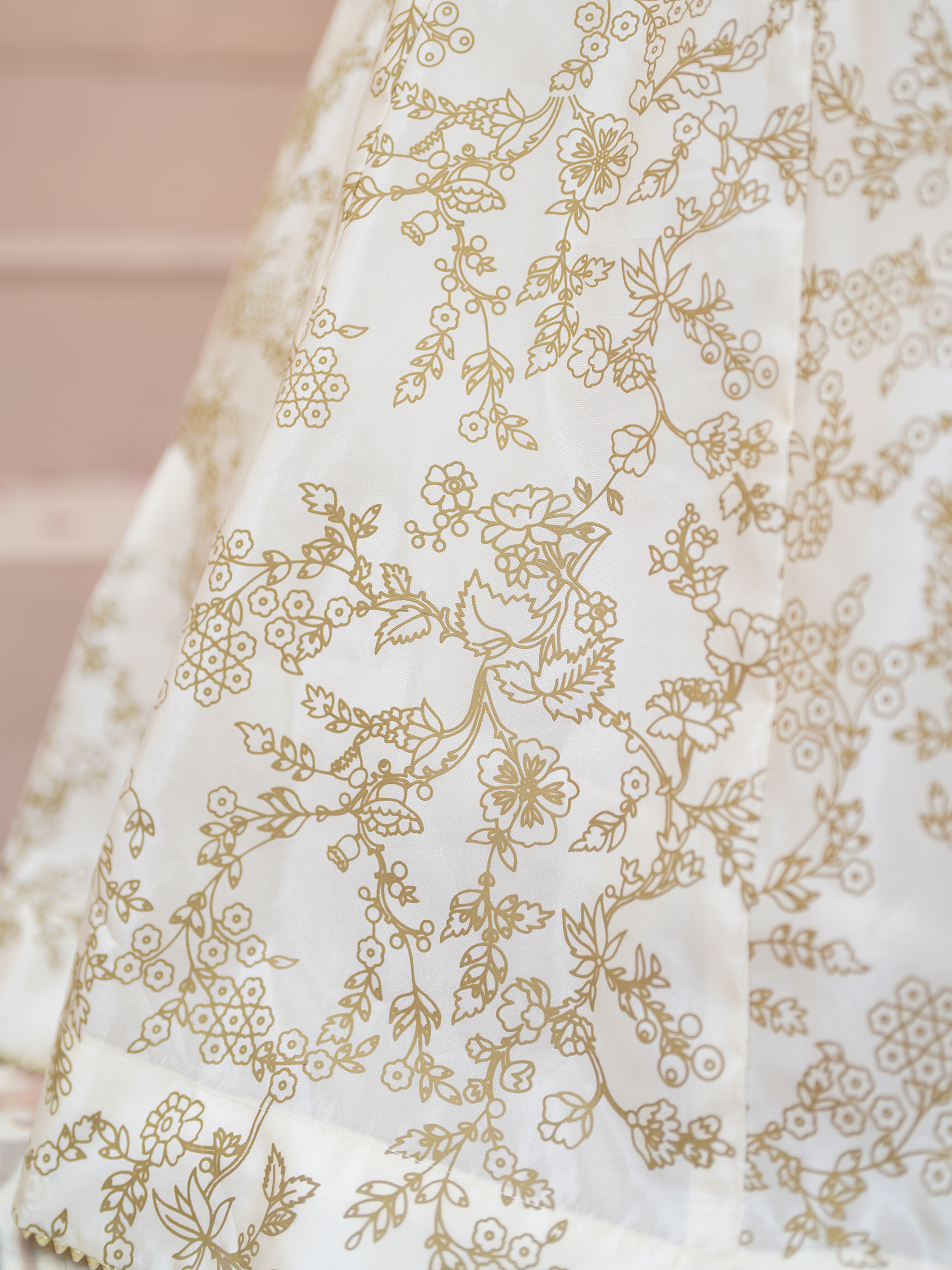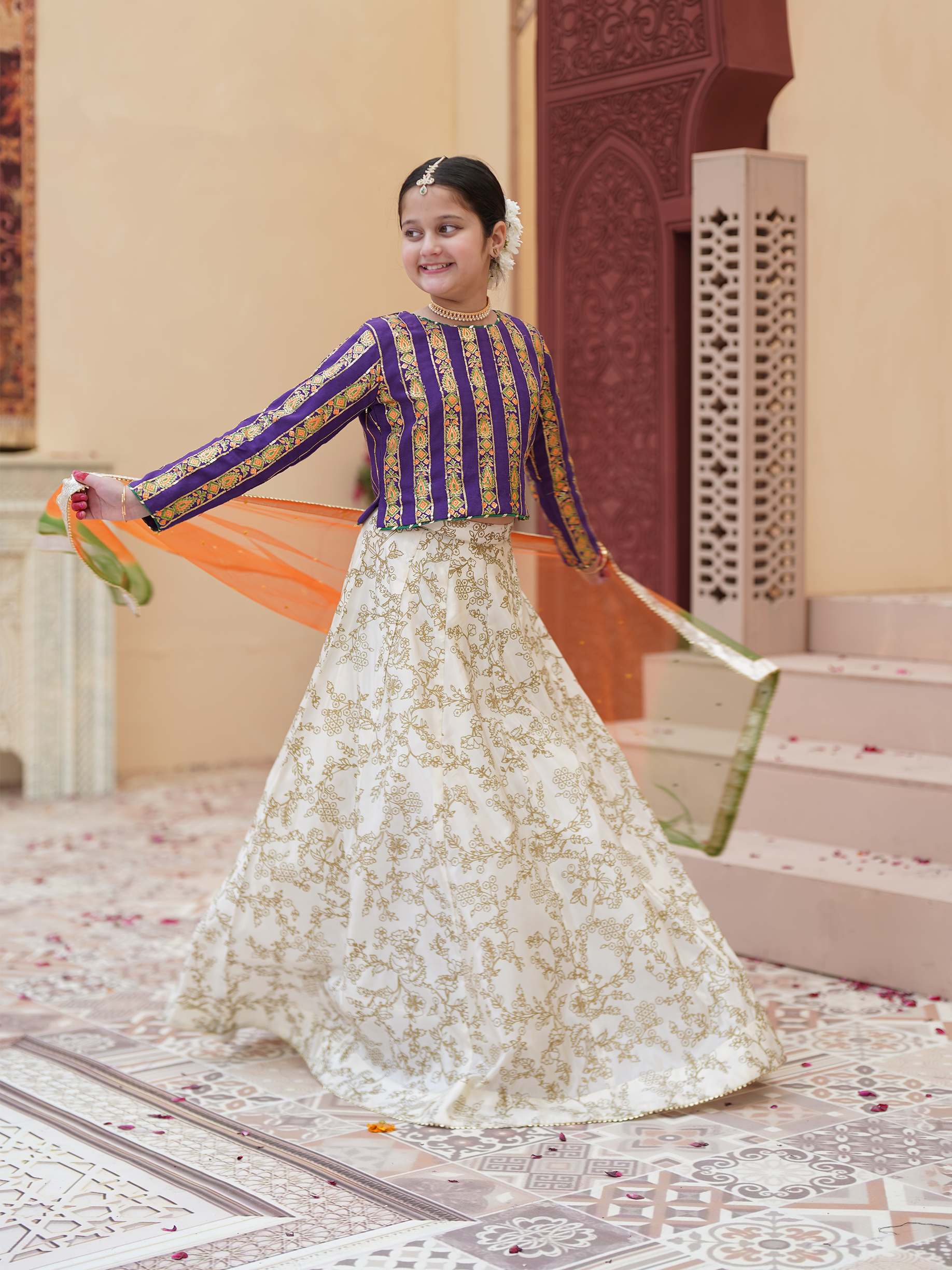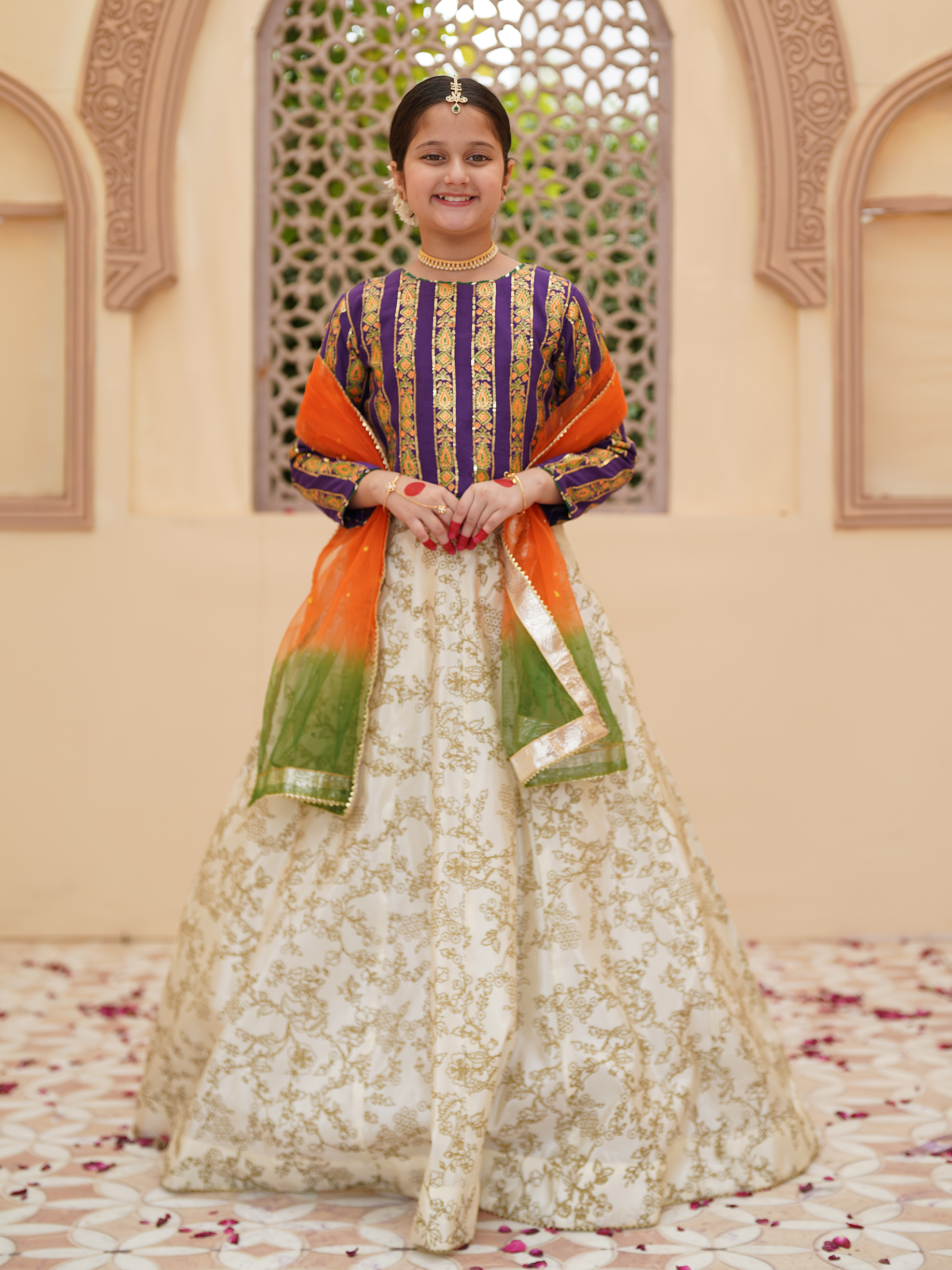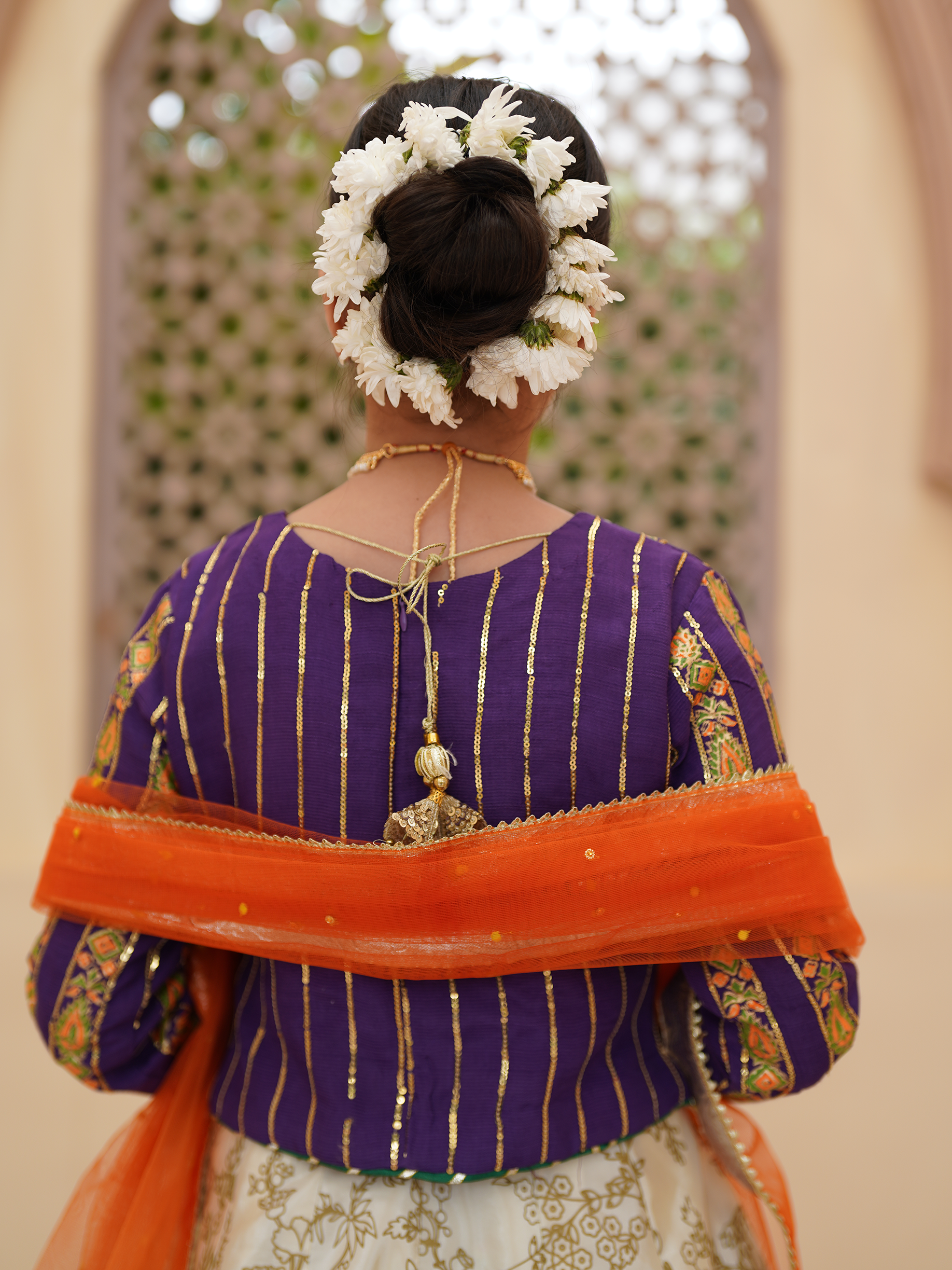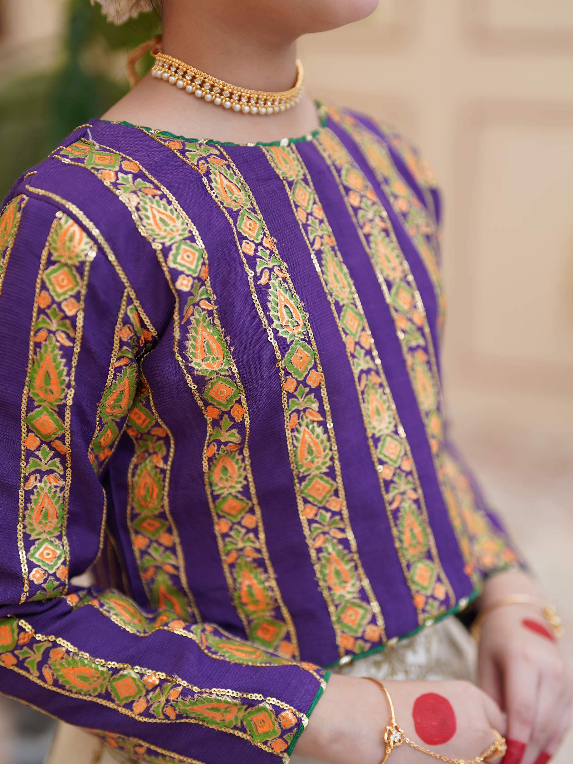 - Fully embroidered soft raw silk choli with green gotta lace and back tassels. Paired with a screen-print silk lehnga featuring high-volume cancan for a fuller look. Comes with a sitara net dupatta to complete the outfit.