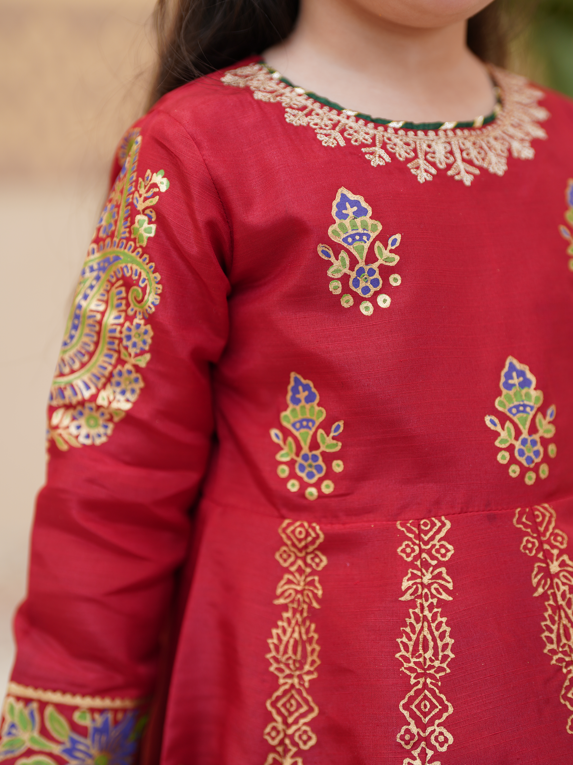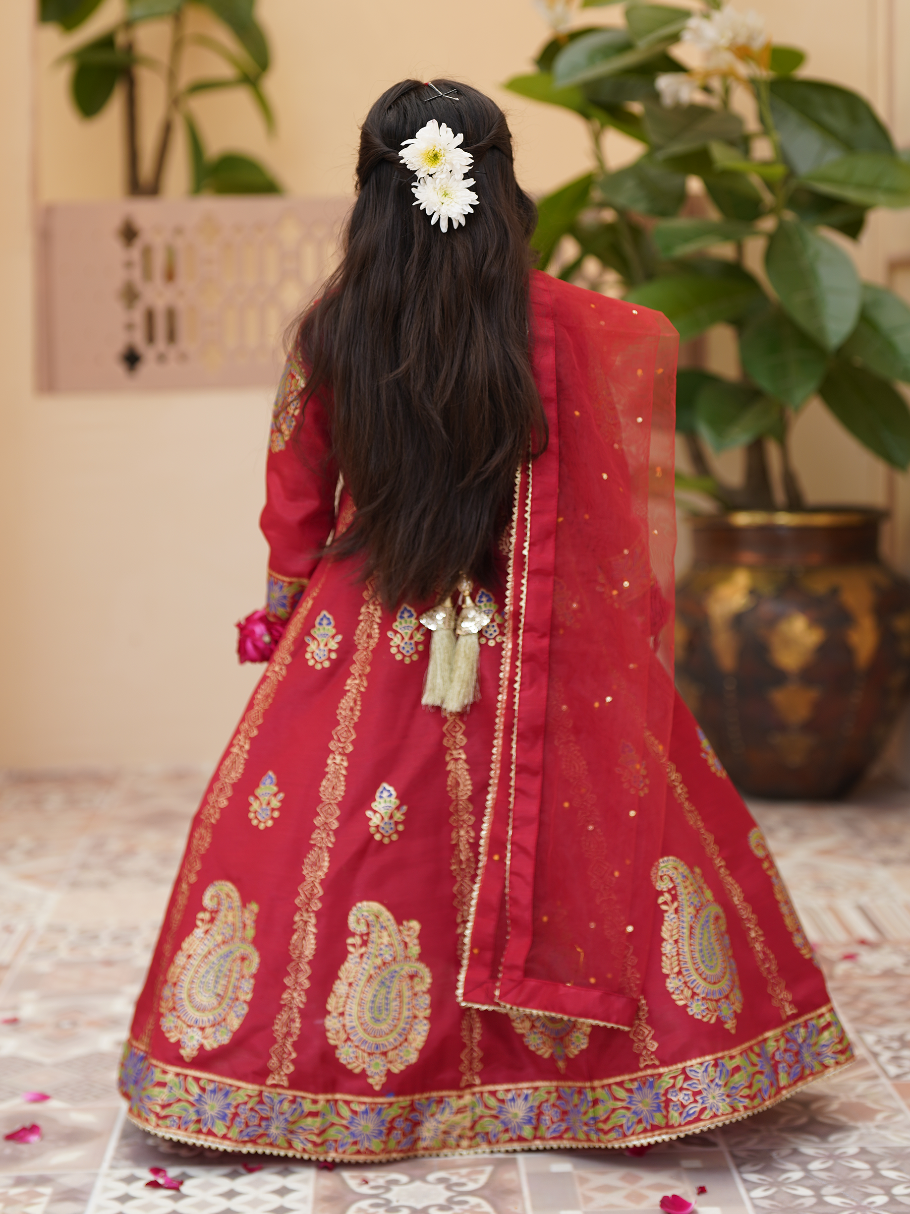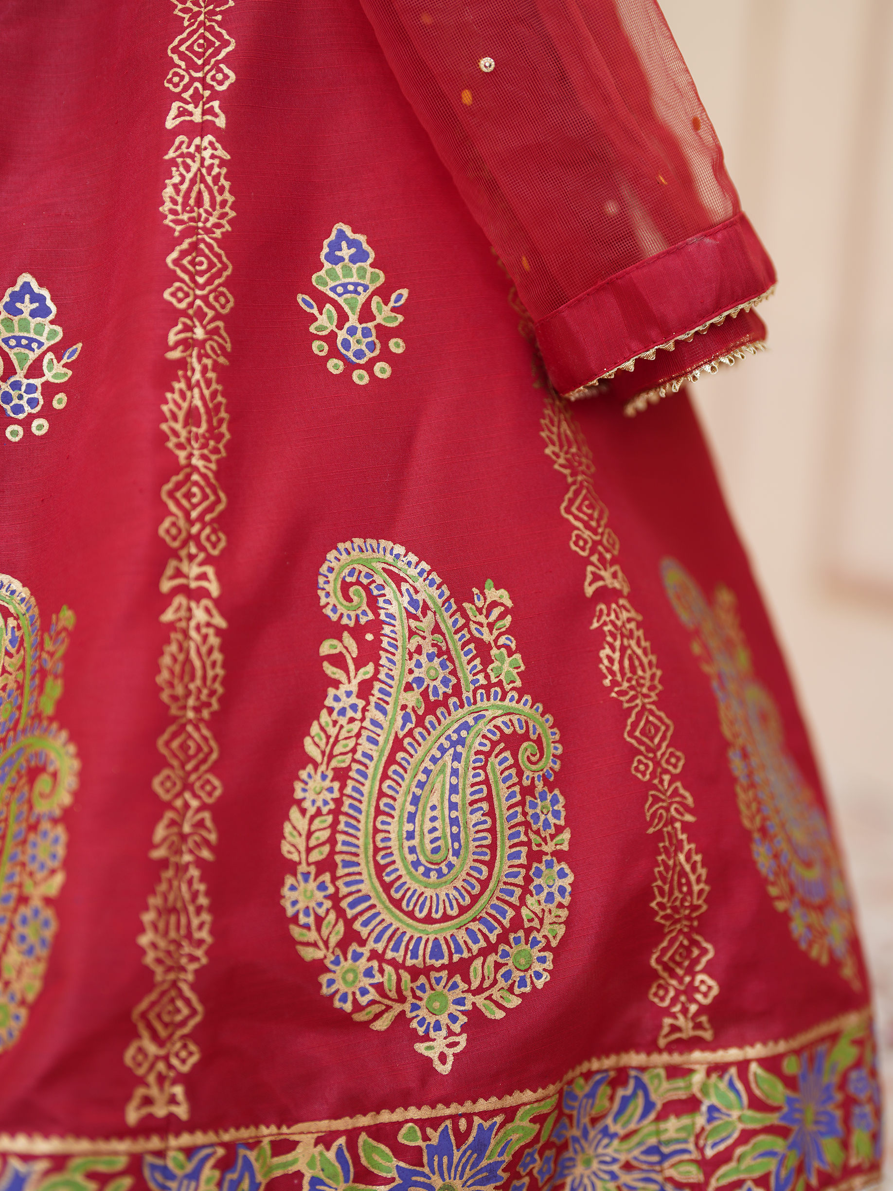 - Raw silk block-printed maxi with an embroidered, green gotta lace neckline and high-volume cancan for a fuller look. Paired with a sitara net dupatta to complete the outfit.