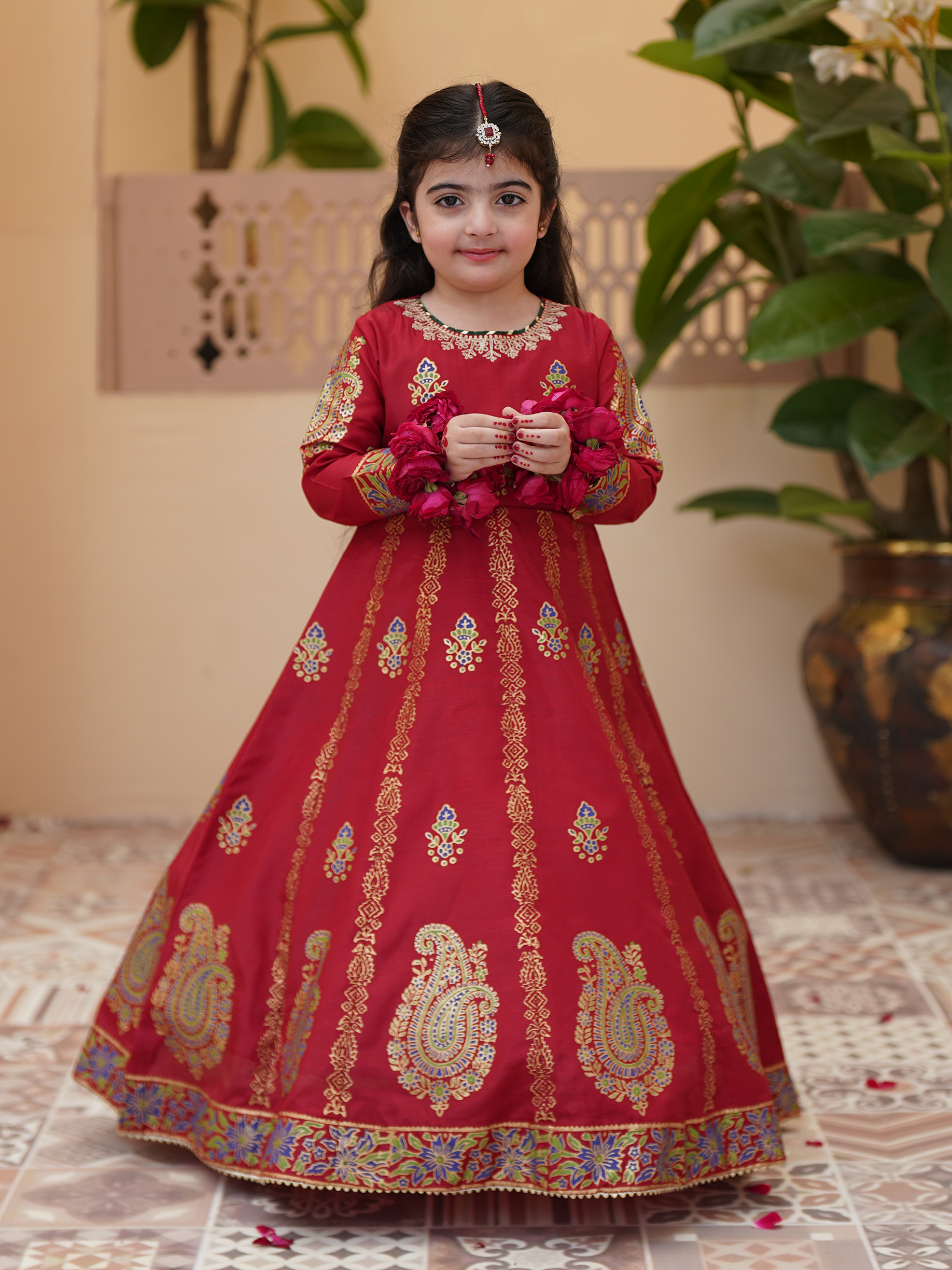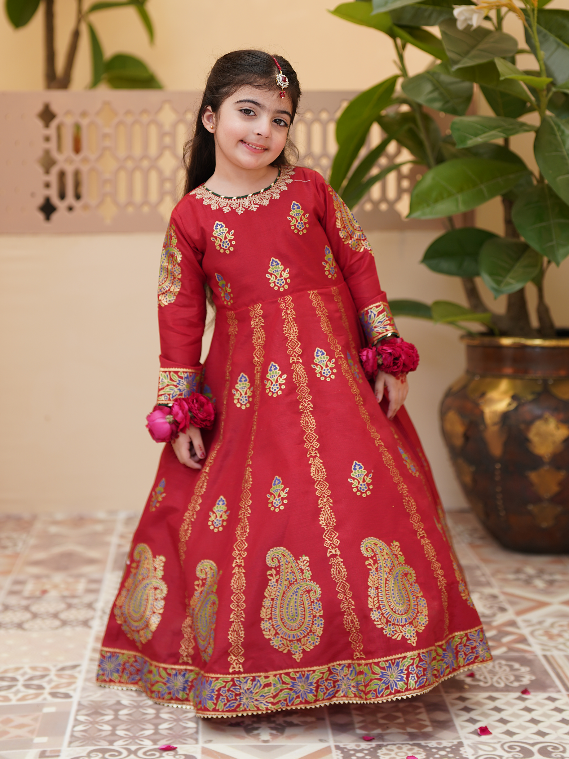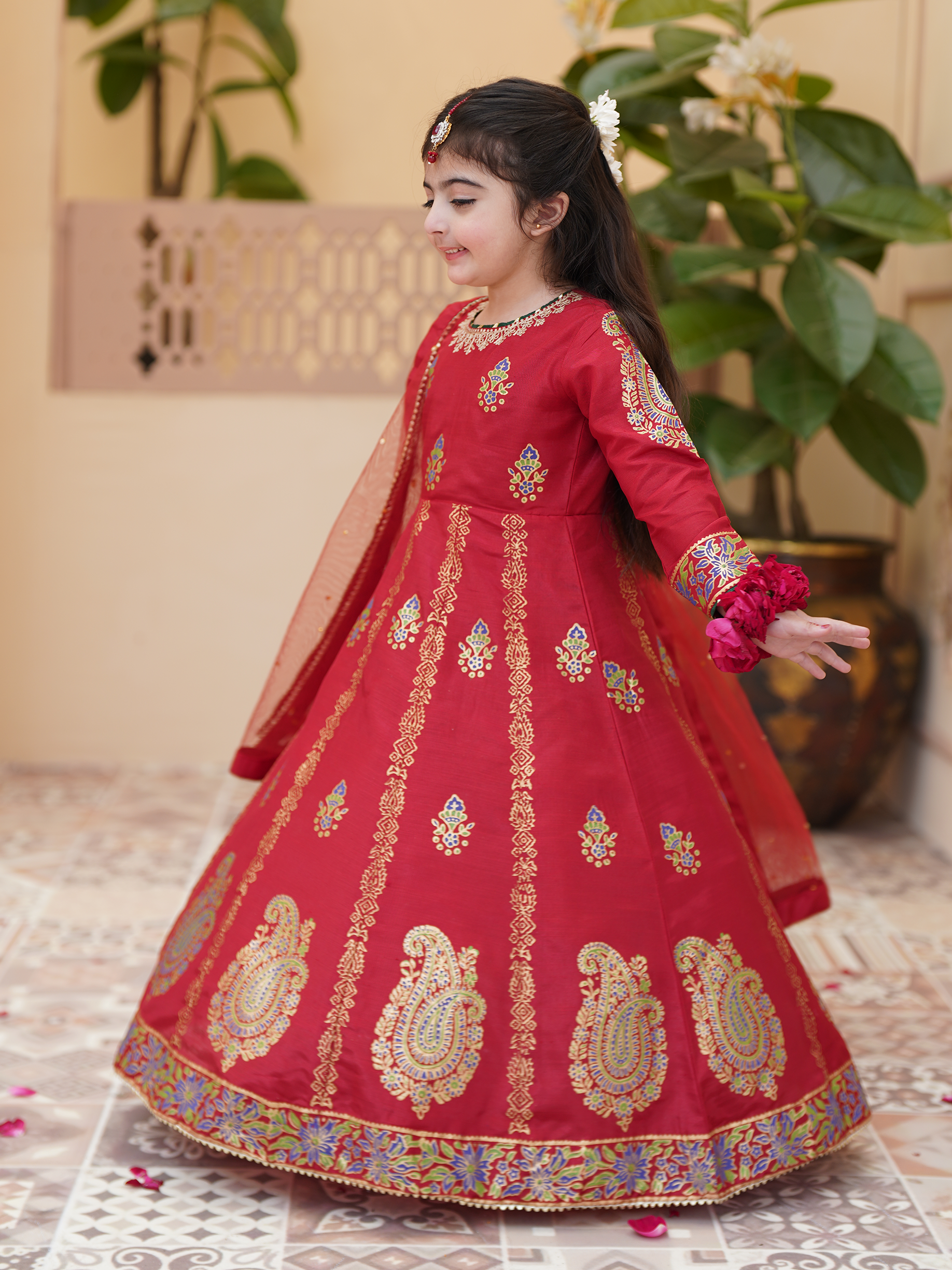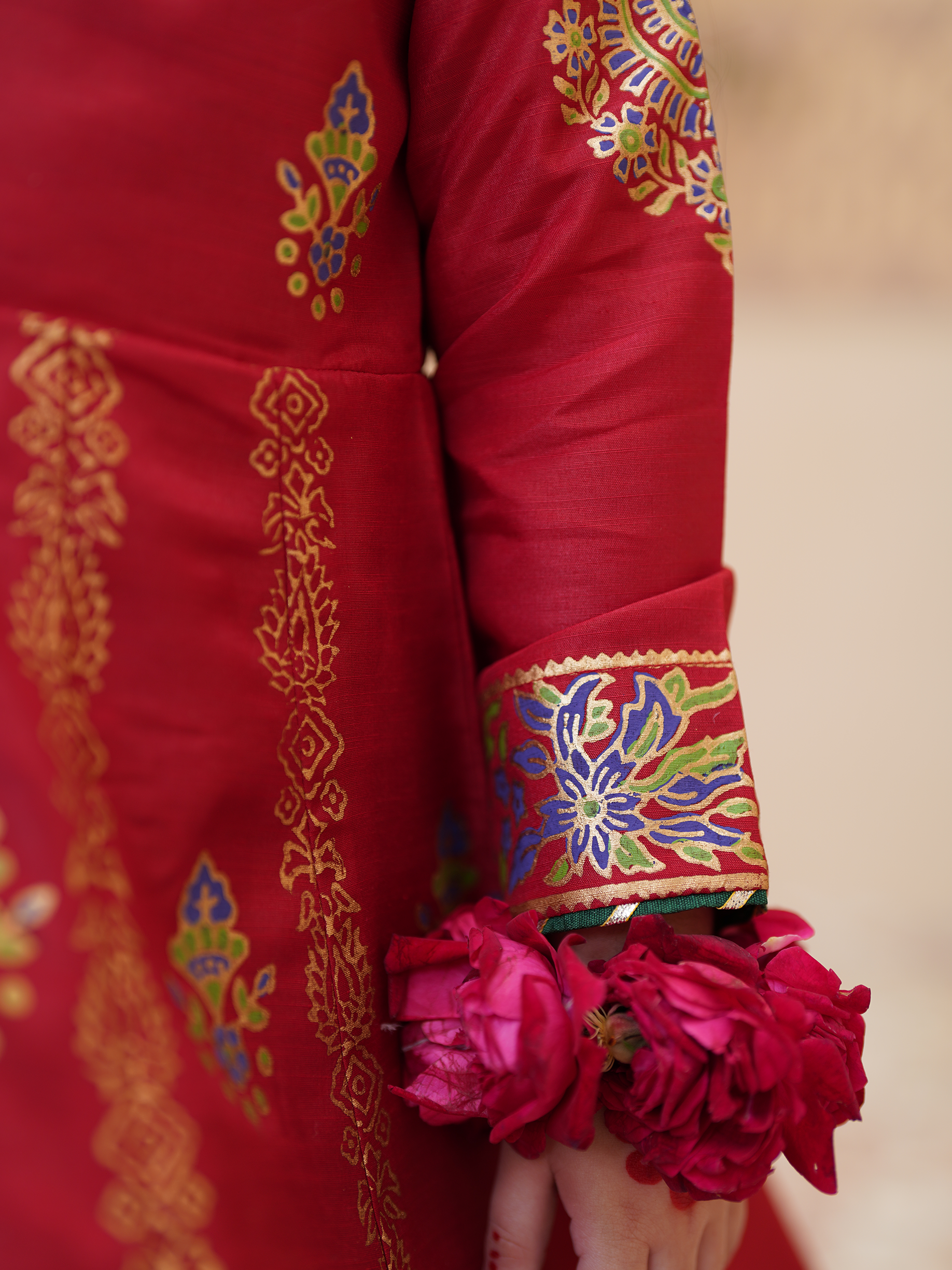 - Raw silk block-printed maxi with an embroidered, green gotta lace neckline and high-volume cancan for a fuller look. Paired with a sitara net dupatta to complete the outfit.