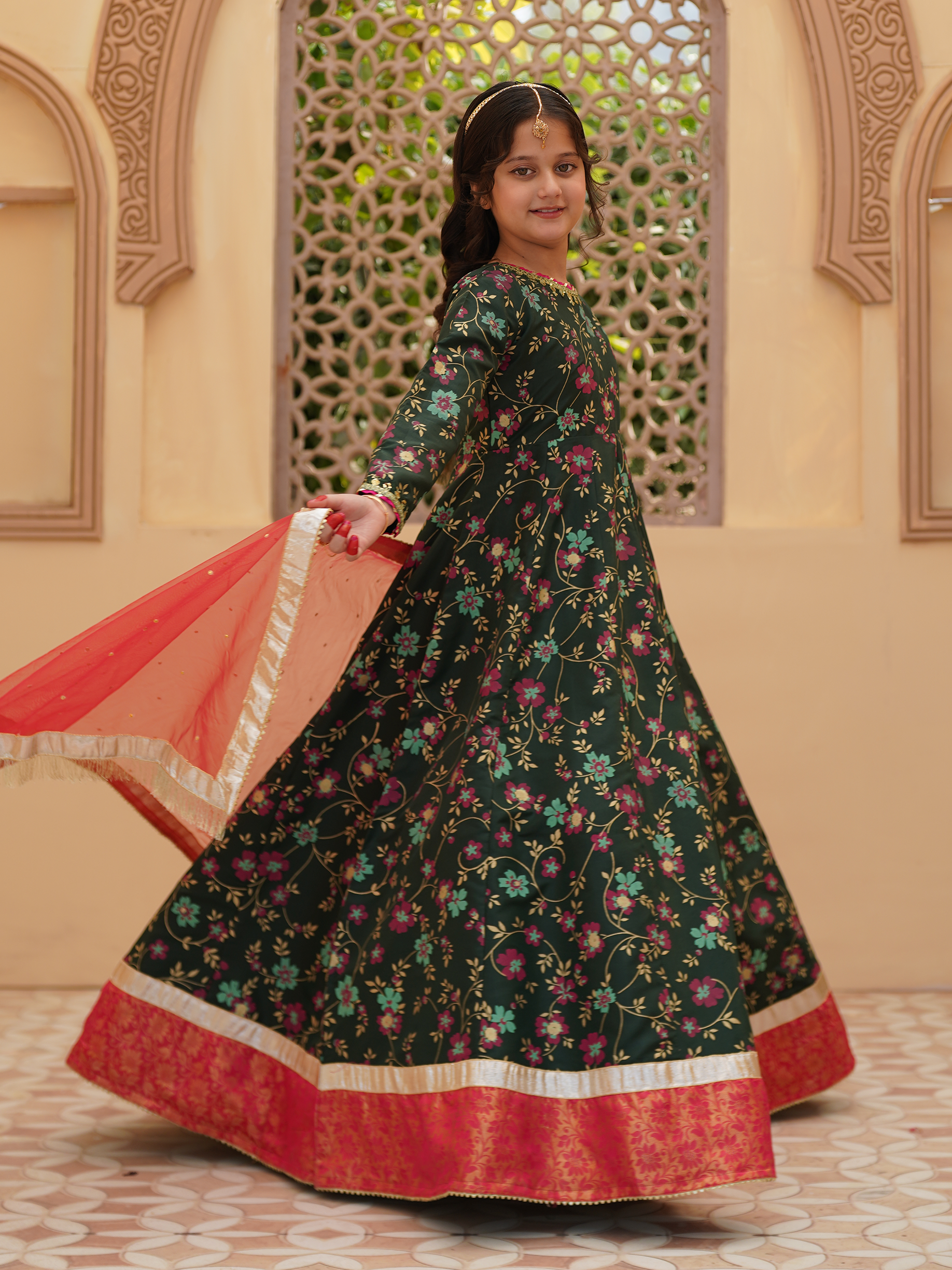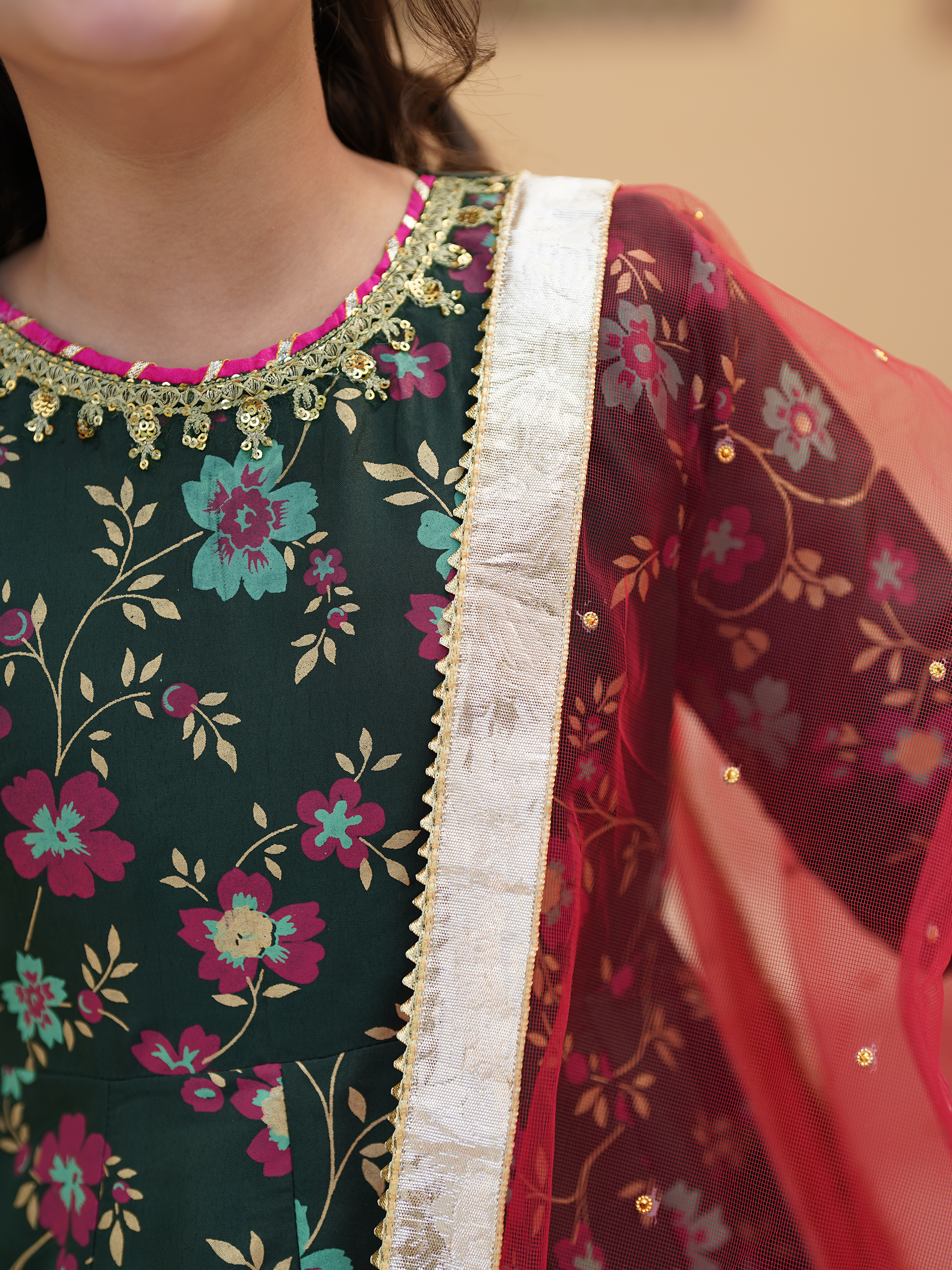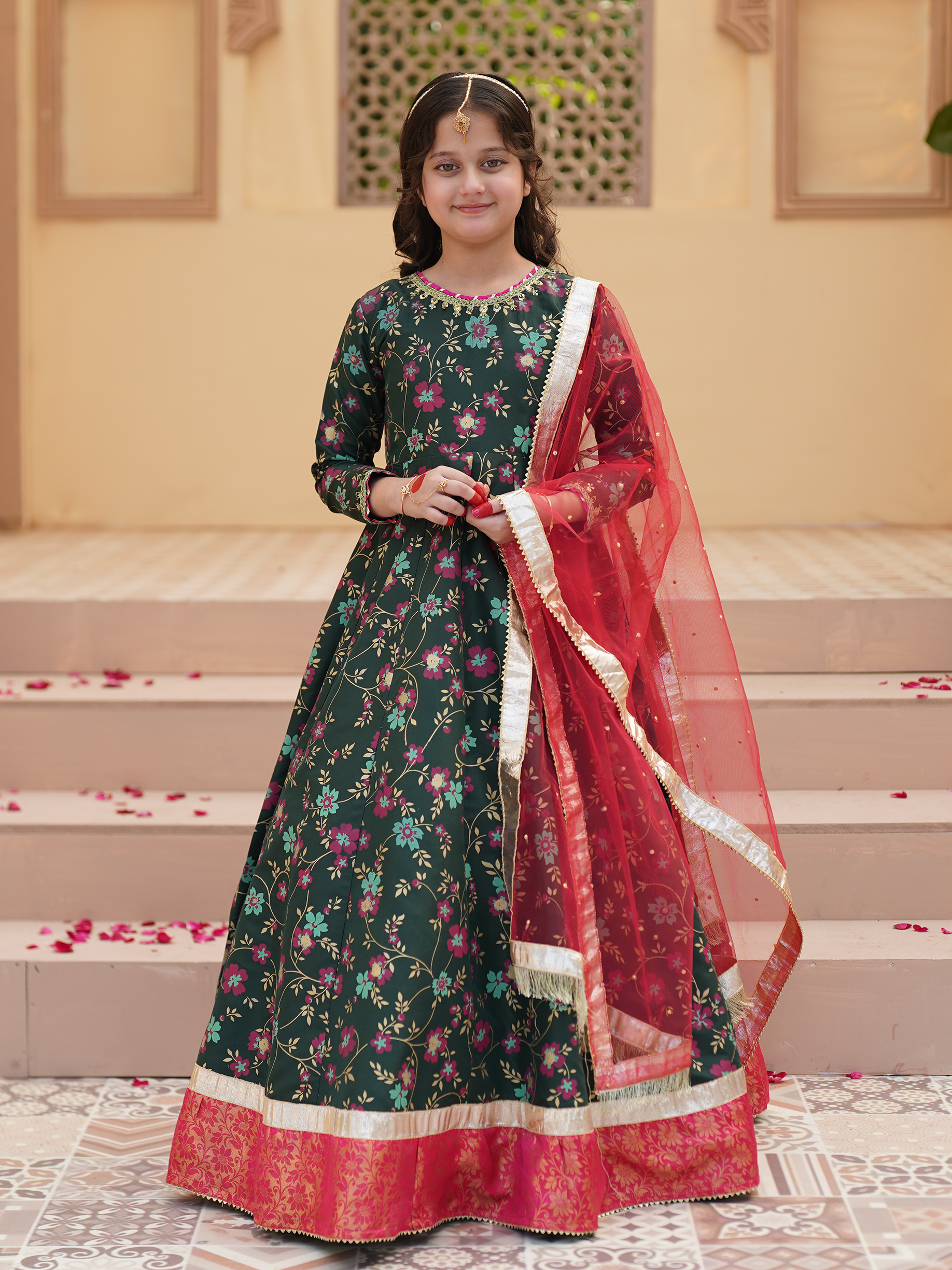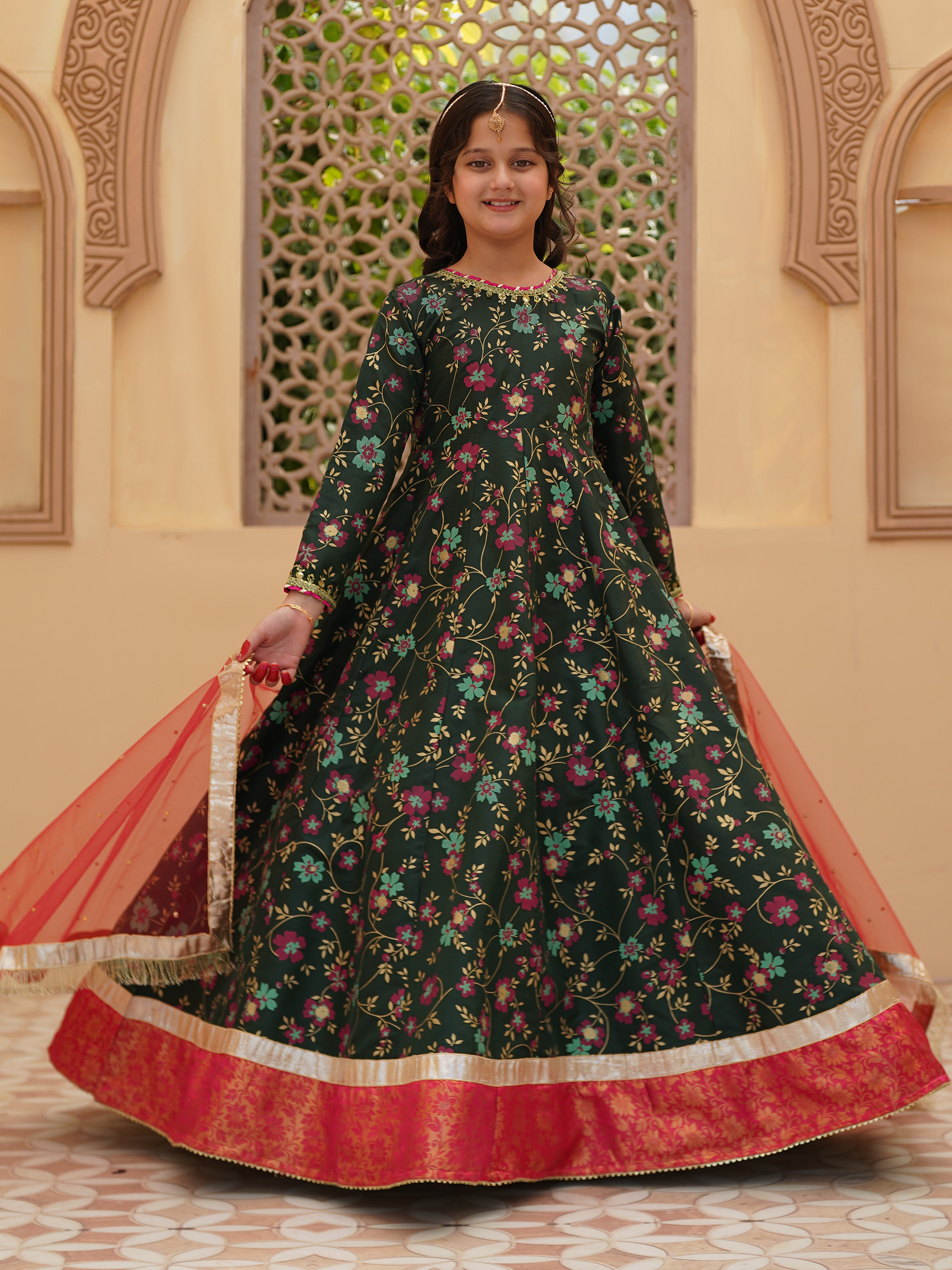 - Screen-printed all-over dress with an embroidered neckline, banarsi border, and lappa on the flare. Comes with attached cancan, back tassels, and a net dupatta finished with kiran lace and gotta detailing. Perfect for festive occasions