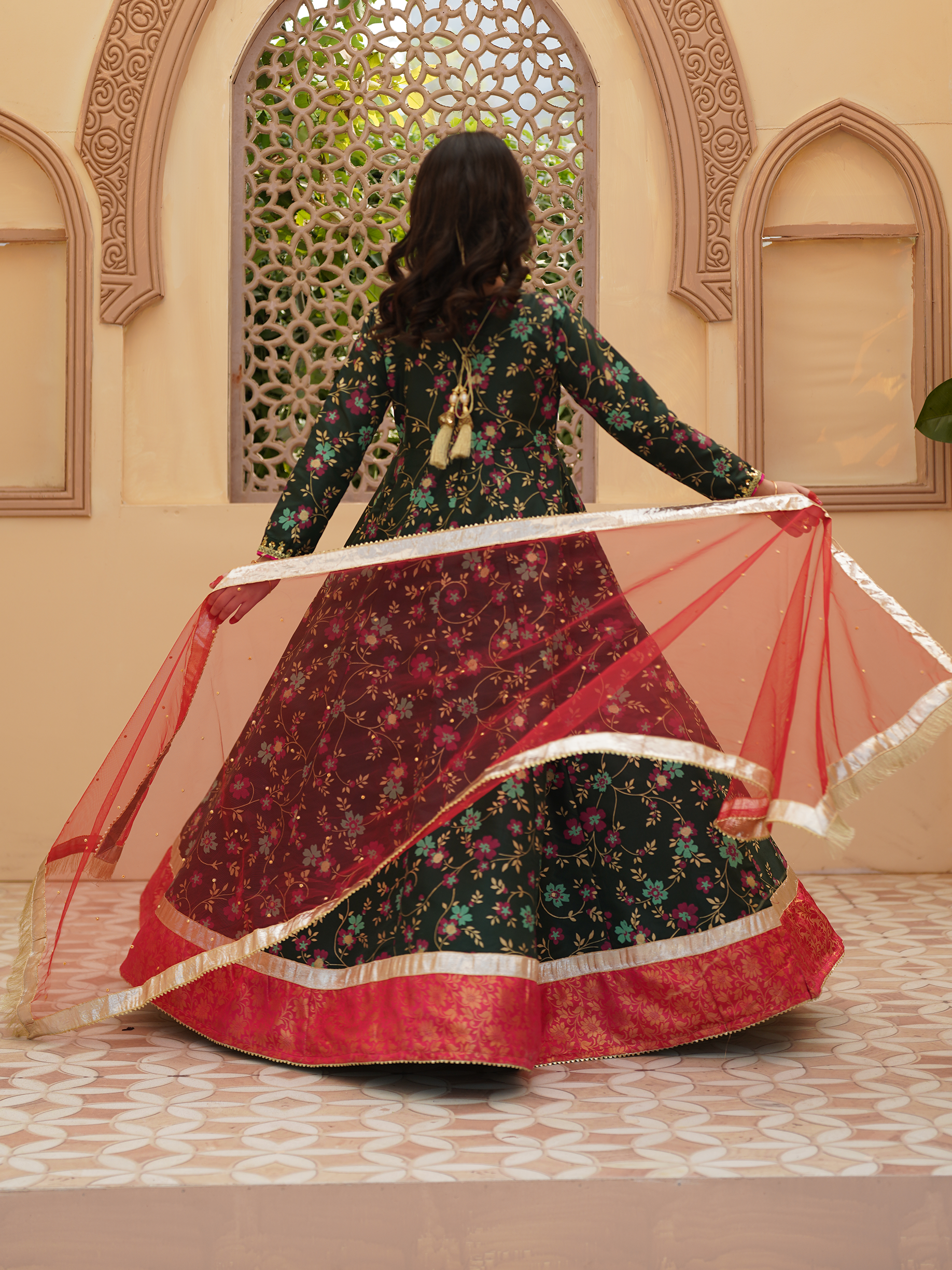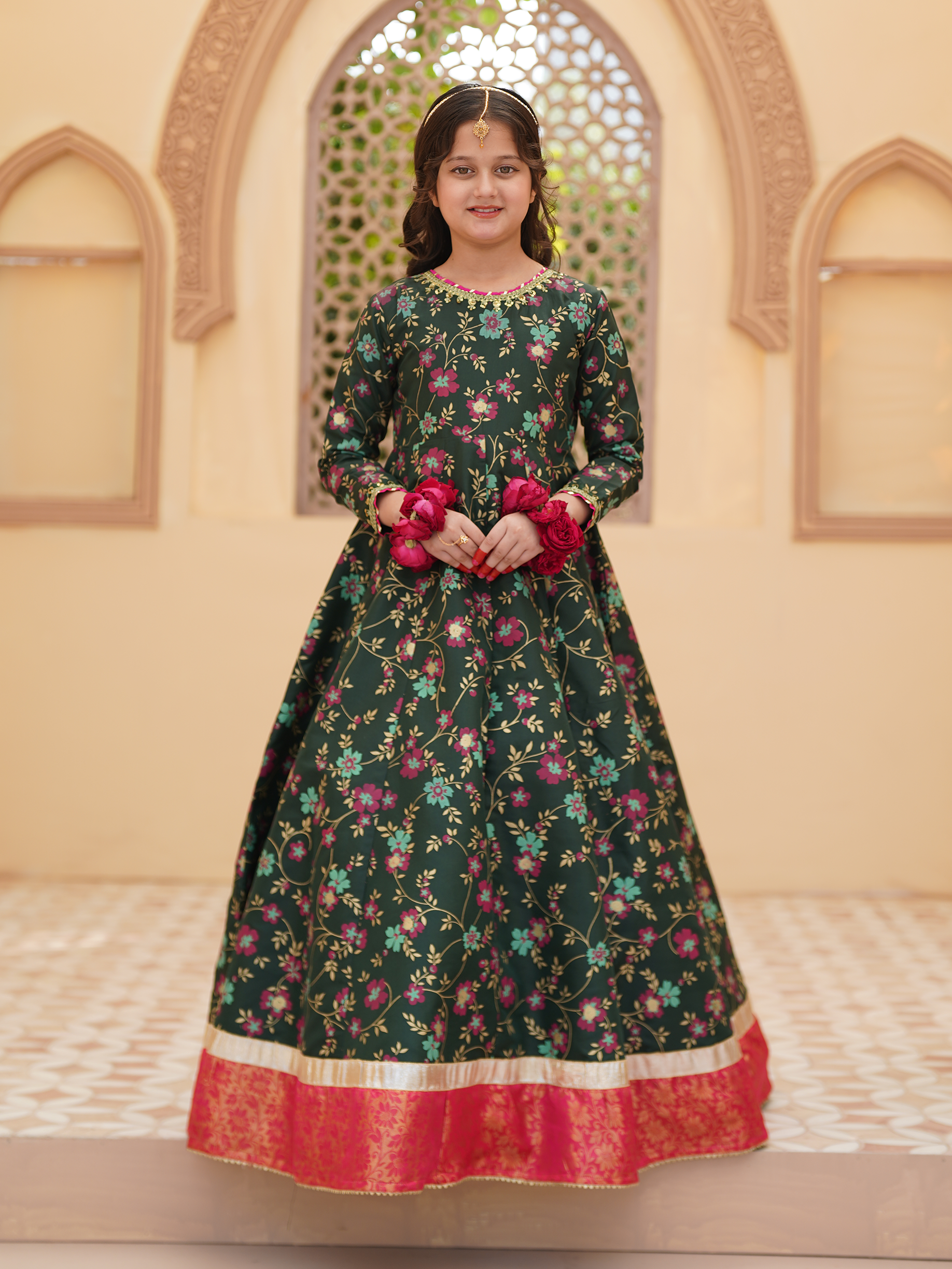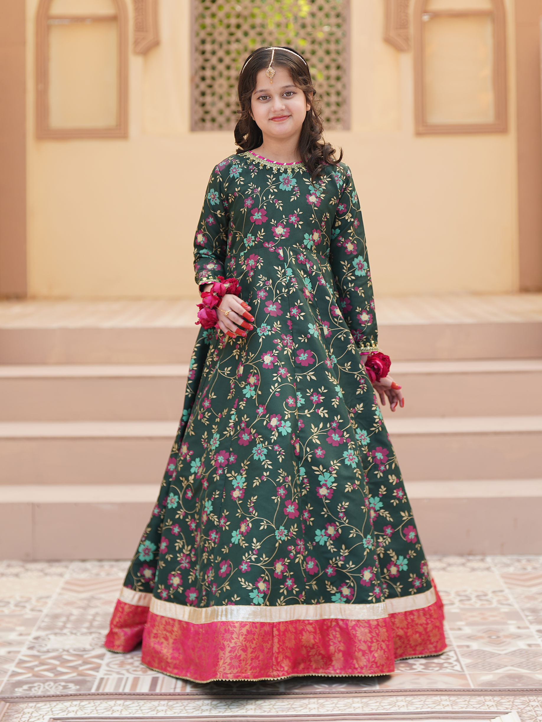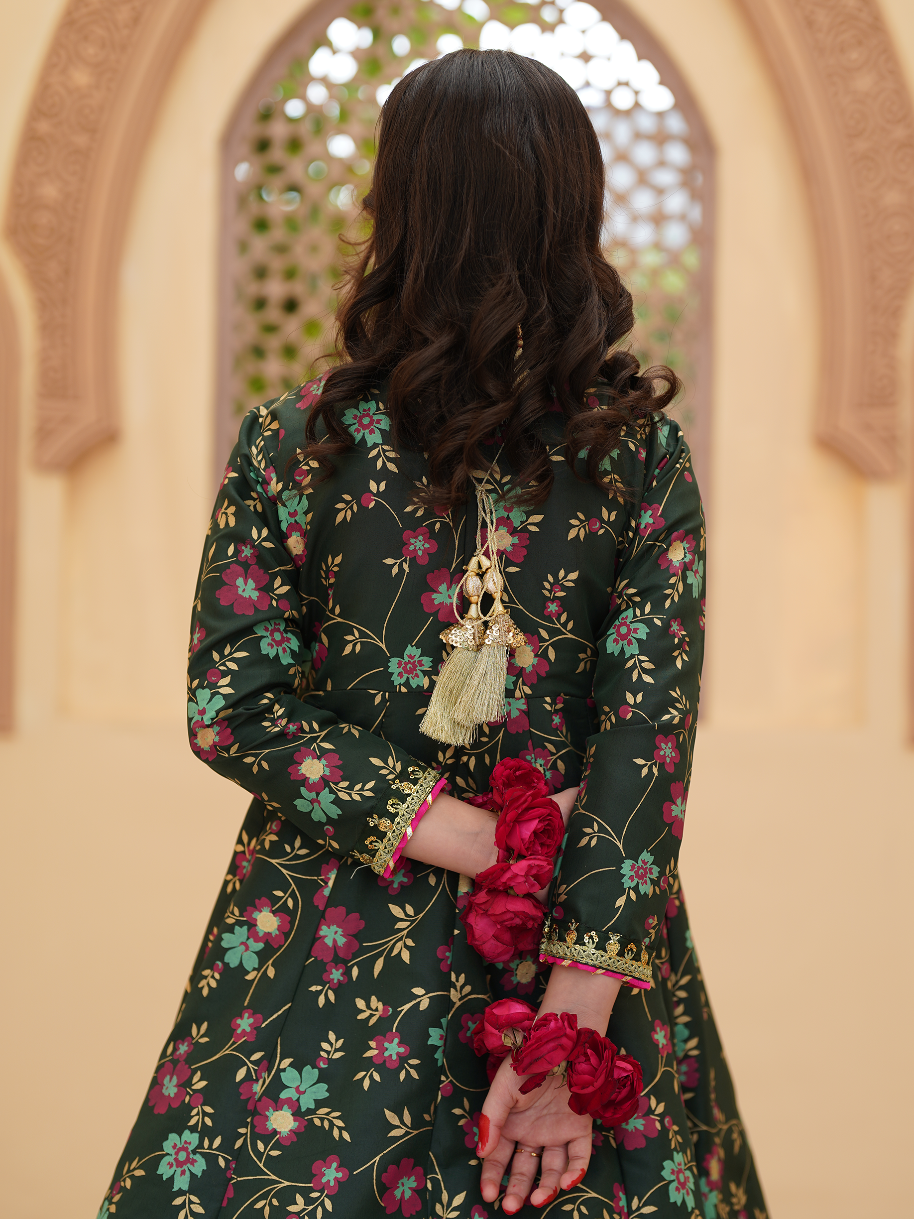 - Screen-printed all-over dress with an embroidered neckline, banarsi border, and lappa on the flare. Comes with attached cancan, back tassels, and a net dupatta finished with kiran lace and gotta detailing. Perfect for festive occasions