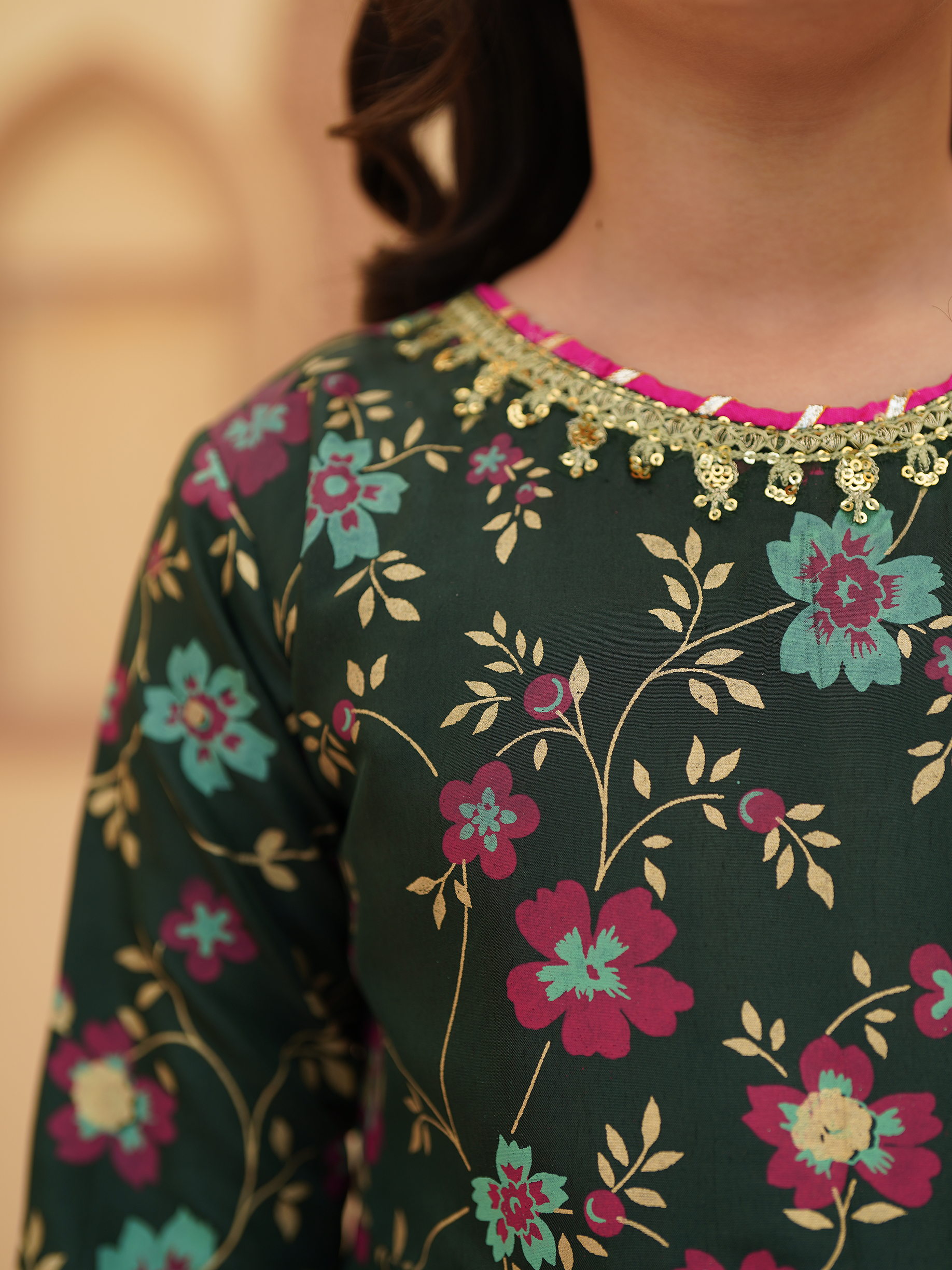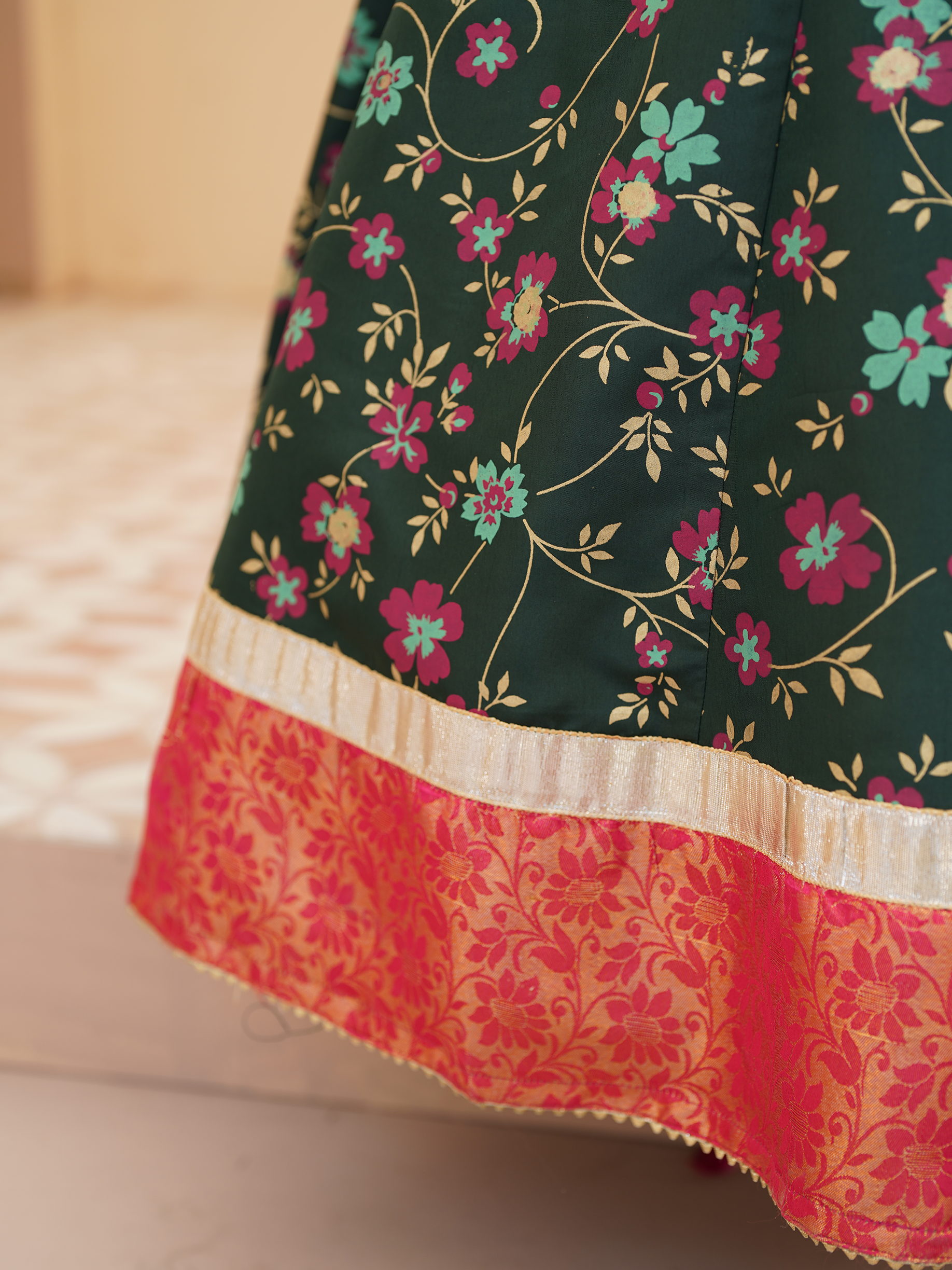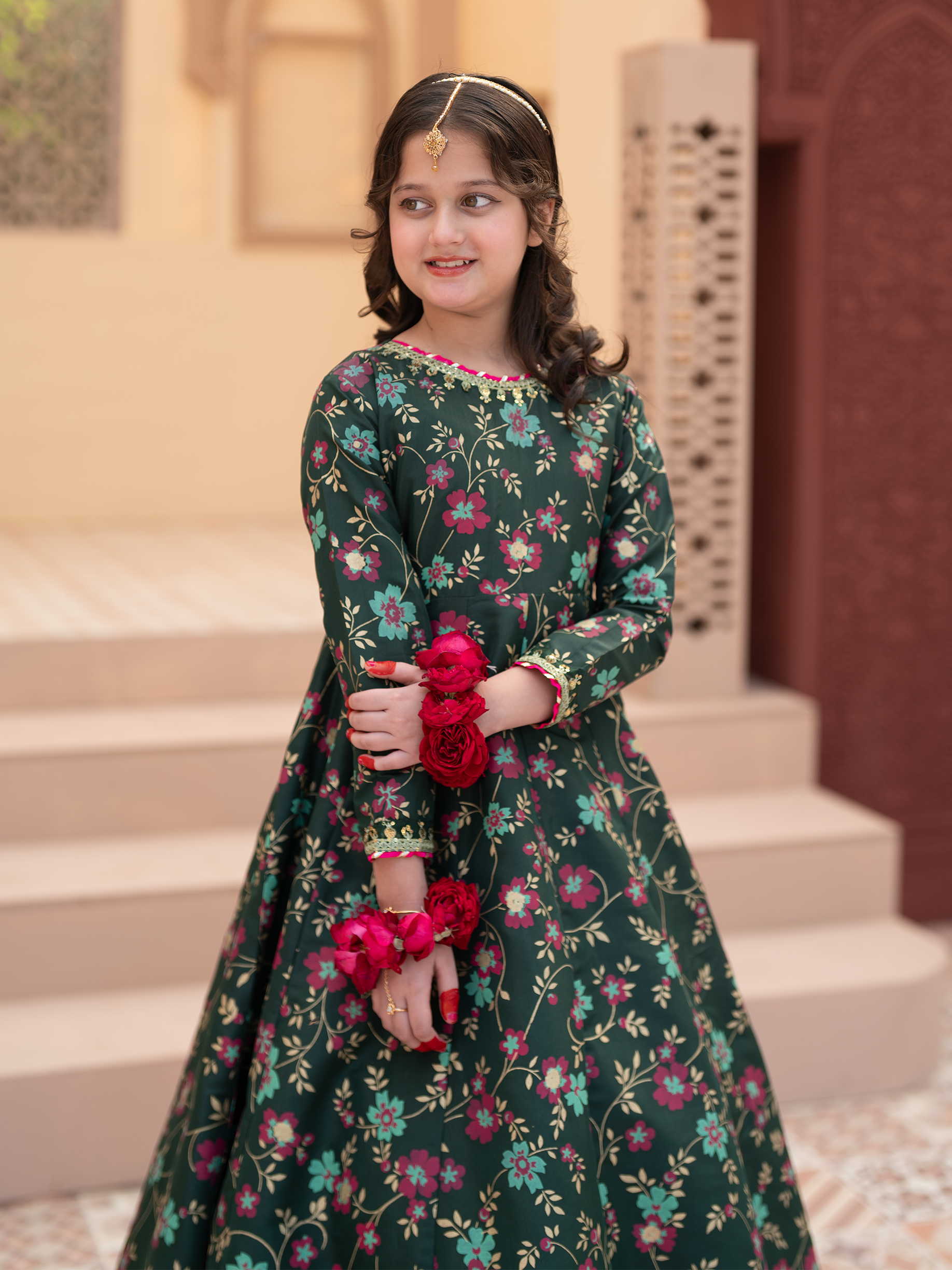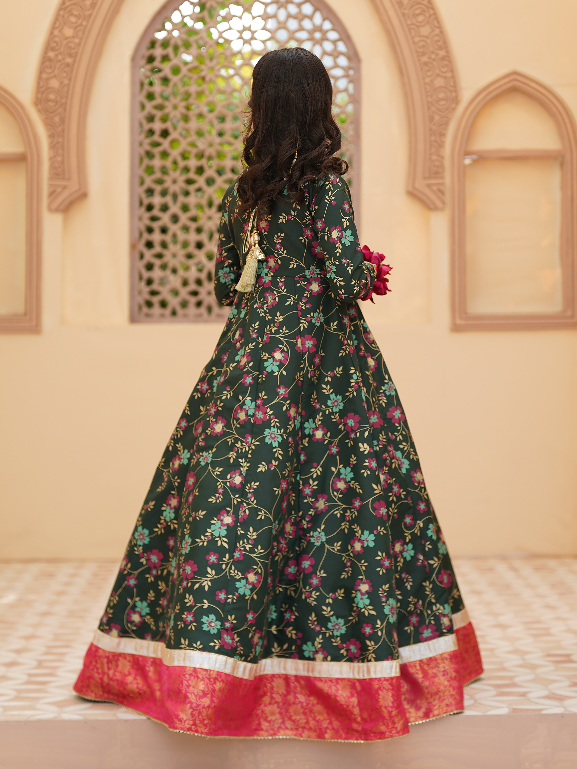 - Screen-printed all-over dress with an embroidered neckline, banarsi border, and lappa on the flare. Comes with attached cancan, back tassels, and a net dupatta finished with kiran lace and gotta detailing. Perfect for festive occasions